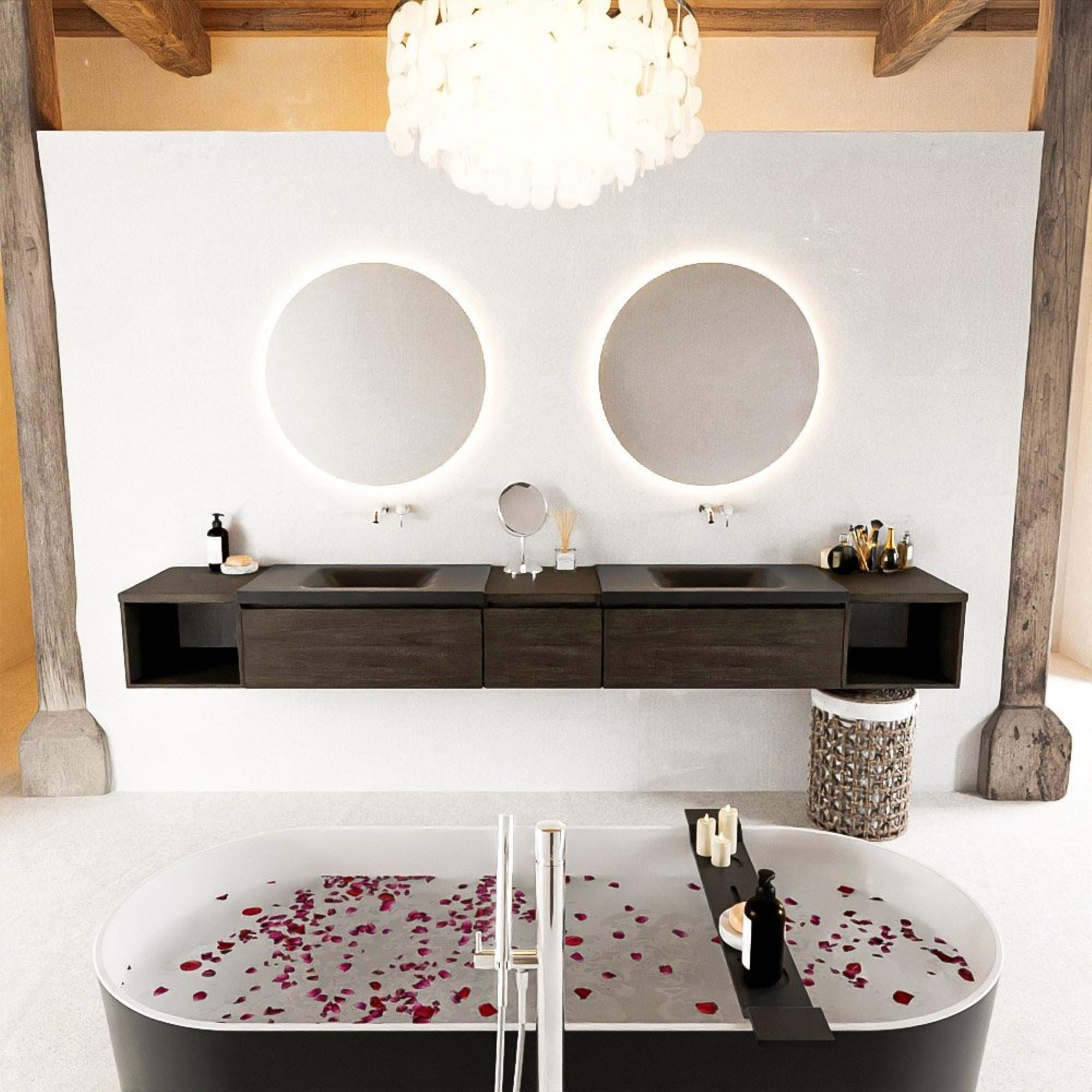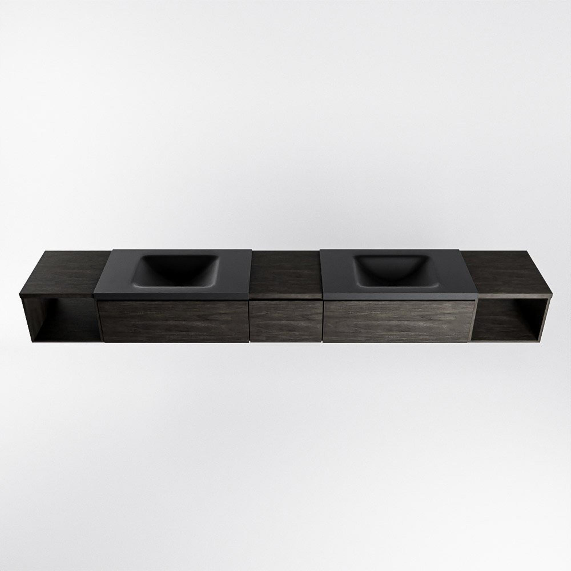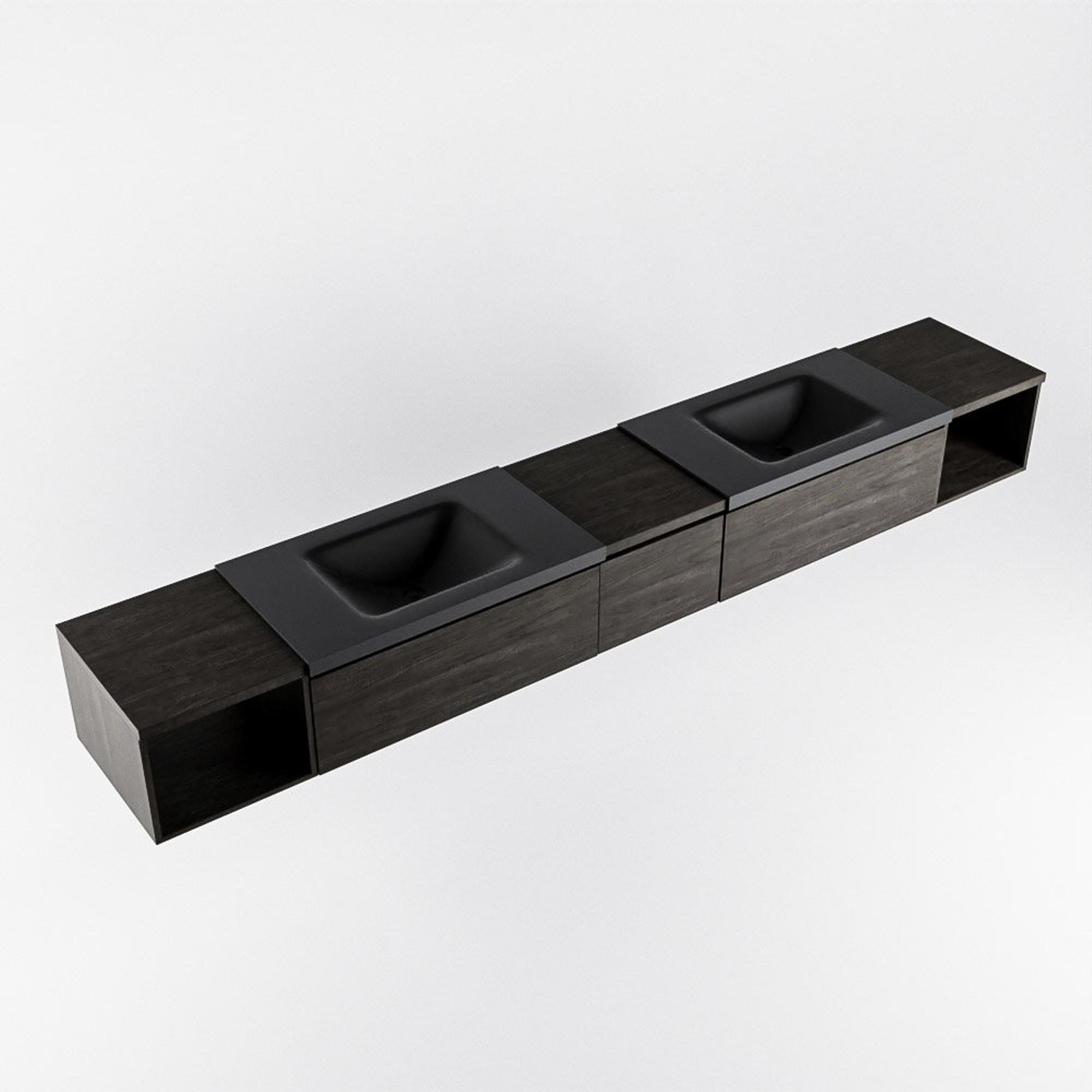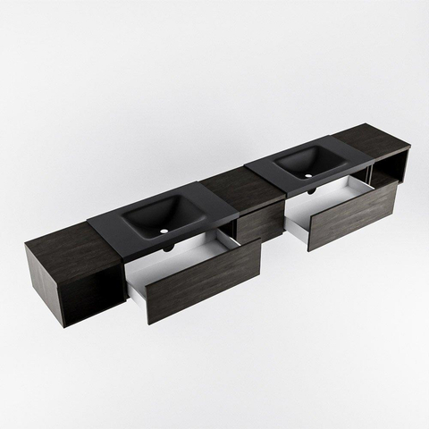 MONDIAZ BUKLA 280cm ensemble de meuble avec module ouvert 40 L+R couleur Marron Foncé avec 3 tiroirs. Lavabo CLOUD double 0 trou de robinet couleur Urban.