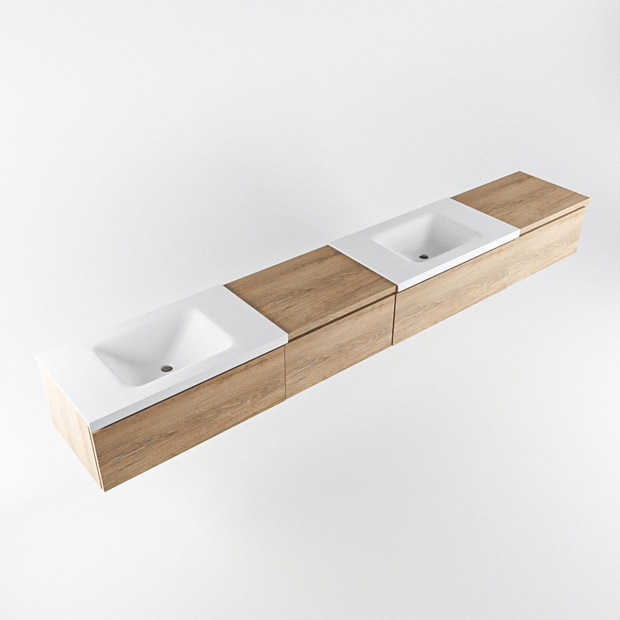 MONDIAZ BUKLA 280cm ensemble de meuble avec module 60 gauche couleur Chêne blanchi avec 4 tiroirs. Lavabo CLOUD double 2 trous de robinet couleur Talc.