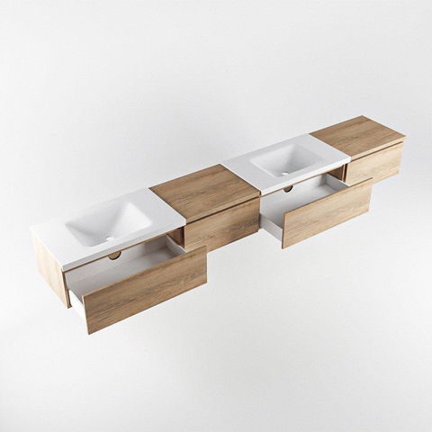 Ce meuble de salle de bain dégage une pure luxe. La combinaison de la couleur Chêne Blanchi et des 4 tiroirs offre une apparence élégante. Le double lavabo avec 2 trous de robinet de couleur Talc ajoute une touche de raffinement à l'ensemble. La sensation de richesse et de confort est indéniablement présente, transformant votre salle de bain en une véritable expérience de spa.