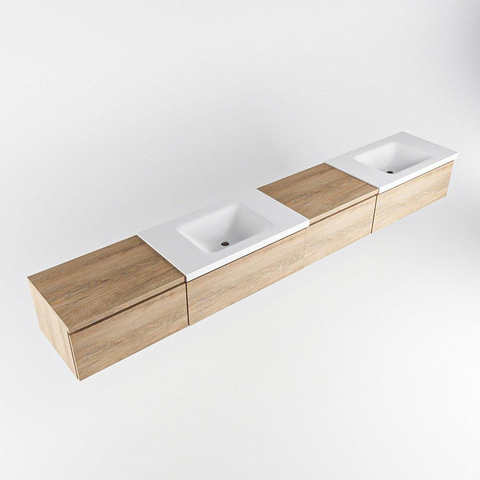 MONDIAZ BUKLA 280cm ensemble de meuble avec module 60 à droite couleur Chêne blanchi avec 4 tiroirs. Lavabo CLOUD double 2 trous de robinet couleur Talc.