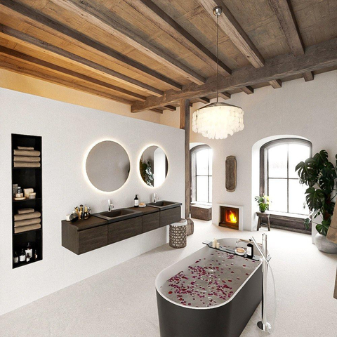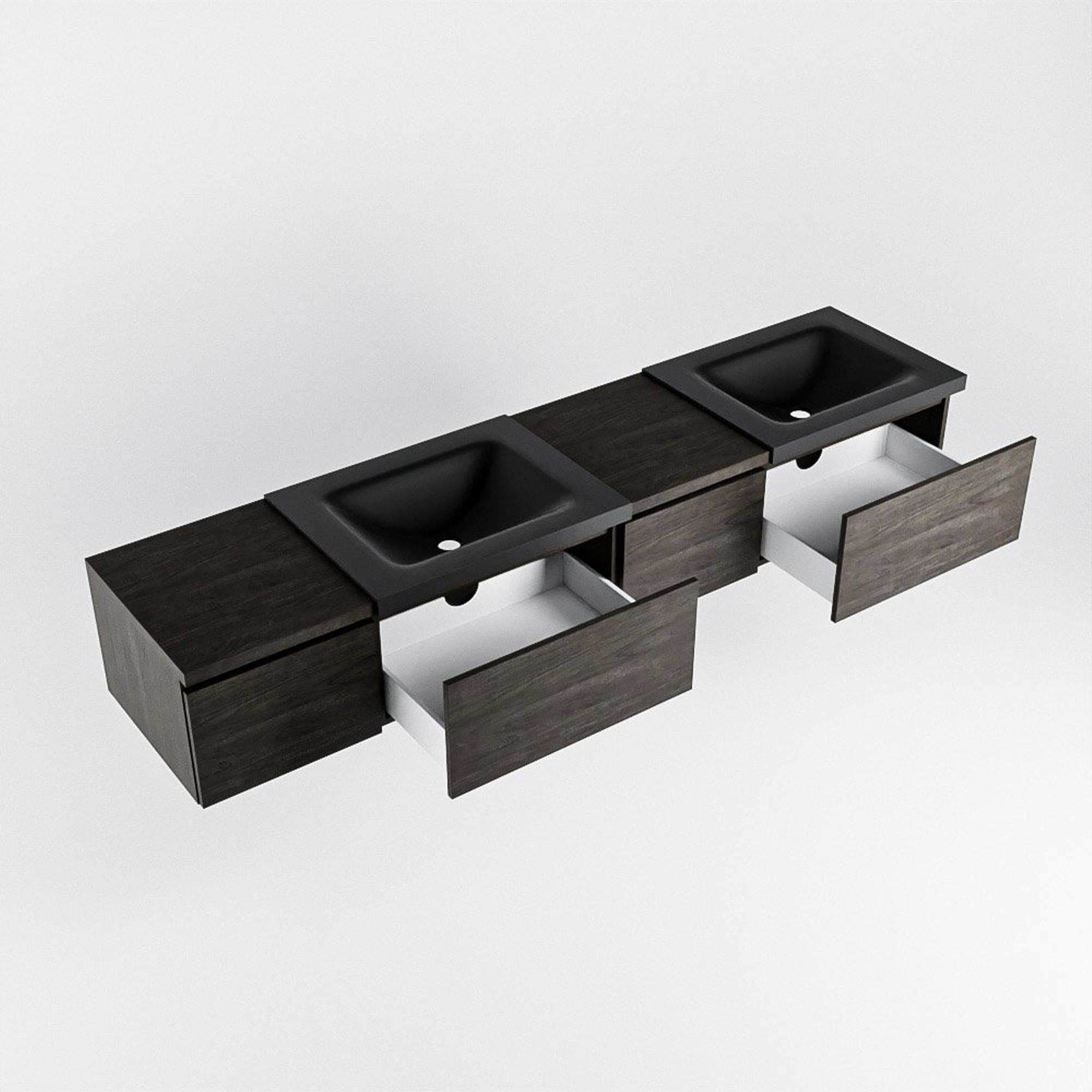 Le lavabo double intégré de la ligne CLOUD, dans la couleur Urban, offre deux zones de lavage complètes avec chacune son propre trou de robinet. Cela rend le brossage des dents ou la routine du matin à deux beaucoup plus détendu, sans bousculade devant le miroir. Les deux vasques sont intégrées de manière homogène dans un seul plan en solid surface, ce qui vous permet de bénéficier de lignes épurées, d'un design moderne et de moins de joints où la saleté peut s'accumuler. Idéal si vous recherchez un meuble-lavabo luxueux à la fois esthétique et fonctionnel. De plus, la combinaison de la teinte bois foncé avec la surface Urban au caractère affirmé crée un contraste élégant qui s'intègre parfaitement dans les salles de bains au style industriel, moderne ou hôtel chic.