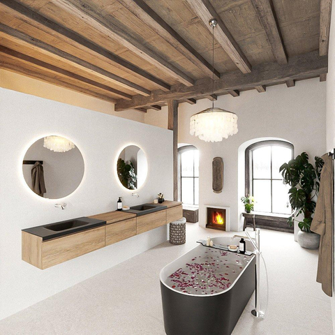 La teinte chaleureuse Washed Oak donne une ambiance naturelle et conviviale à votre salle de bains, sans paraître chargée. Le décor bois du meuble en mélamine est facile d’entretien et résiste bien à une utilisation quotidienne. Le lavabo double CLOUD de couleur Urban (anthracite, solid surface) y ajoute une touche contemporaine et luxueuse. Le solid surface est connu pour son aspect lisse et sans joints et se nettoie facilement. La combinaison du bois clair avec un lavabo foncé s’accorde parfaitement avec les tendances actuelles de la salle de bains et se marie très bien avec des robinets noirs, des carreaux effet béton ou, au contraire, avec une robinetterie blanche sobre.