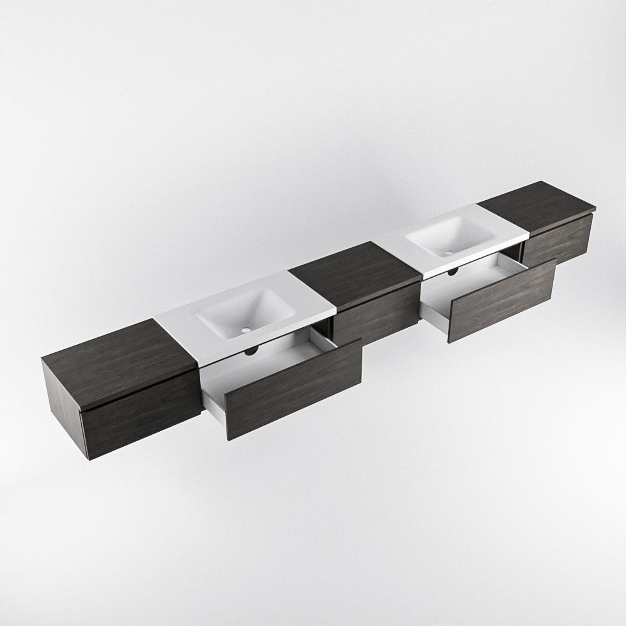 La couleur bois Dark Brown donne immédiatement à votre salle de bains une apparence chaleureuse et haut de gamme et s’harmonise sans effort avec des styles d’intérieur populaires comme le moderne, l’industriel ou le Japandi. Le lavabo double de couleur Talc, un blanc mat, forme un contraste élégant avec le meuble sombre. Cet effet bicolore crée une belle séparation entre la partie humide et la partie sèche du meuble et permet à votre plan de toilette de paraître toujours calme. Associez l’ensemble à des robinets et accessoires noirs, en inox ou couleur chrome pour finaliser le look selon vos préférences.