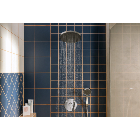 La douchette à main est équipée de deux types de jets différents : une douce pluie et un jet d’impact puissant. Grâce au bouton Select, vous changez facilement entre ces modes, même sous la douche. Avec FlexPower, les buses de jet s’adaptent automatiquement à la pression de l’eau, assurant un jet constant et confortable. La douche est également équipée d’un anneau filtrant lavable et d’un conduit d’eau interne, ce qui facilite l’entretien et améliore la qualité de l’eau. Vous vivez ainsi toujours une expérience de douche optimale sans tracas.