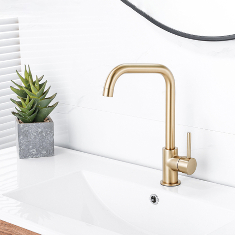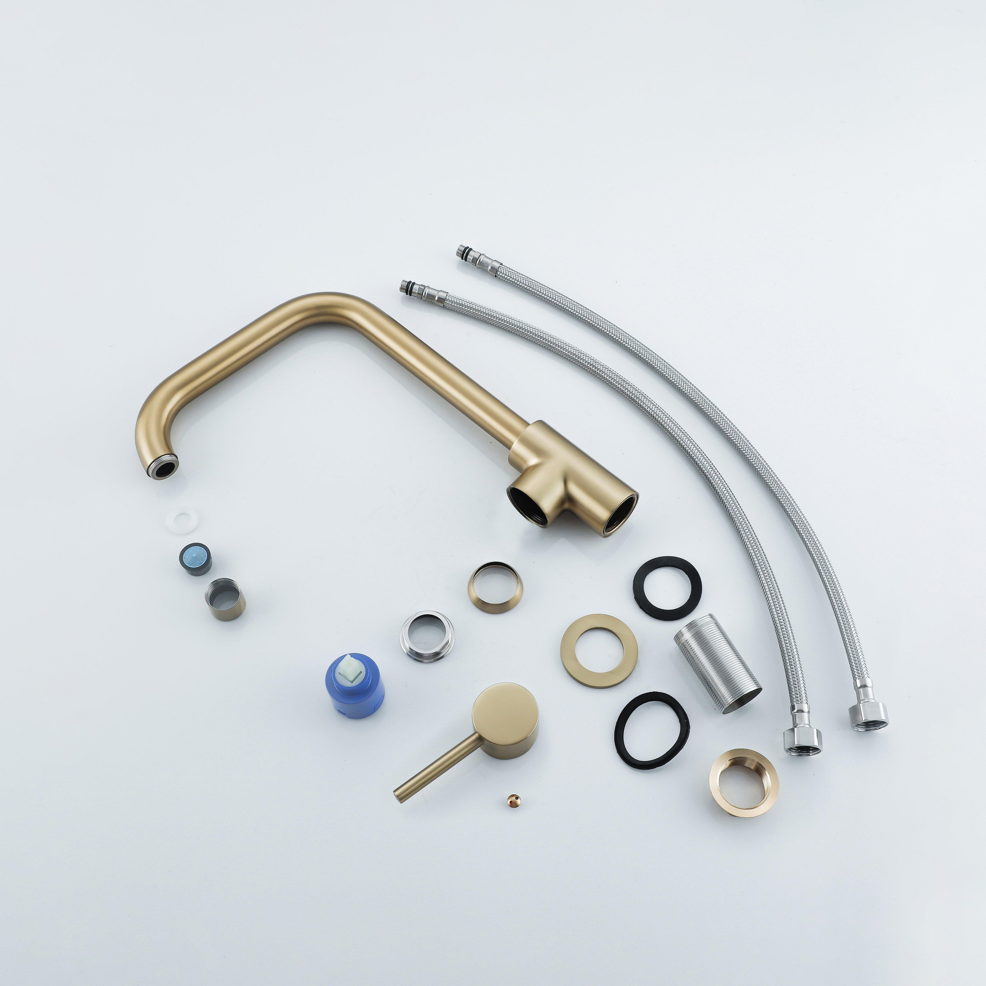 Avec ce magnifique robinet de cuisine haut de gamme, vous donnez immédiatement à votre cuisine une allure luxueuse. L'or mat crée une ambiance chaleureuse et élégante qui apporte une touche unique et moderne à votre cuisine. Grâce au modèle haut, vous disposez de plus d'espace sous le robinet, ce qui facilite grandement le remplissage de grandes casseroles ou le nettoyage de l'évier. Ce robinet allie élégance et fonctionnalité pratique, pour que vous profitiez chaque jour de commodité et de confort. Le design épuré s'intègre facilement dans diverses cuisines, du classique au contemporain, et élève votre cuisine à un niveau supérieur. Ainsi, cuisiner et faire la vaisselle ne sont pas seulement des tâches, mais une expérience agréable.