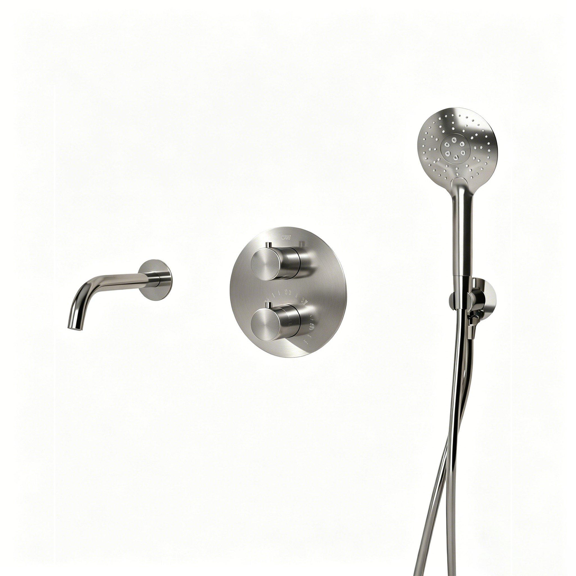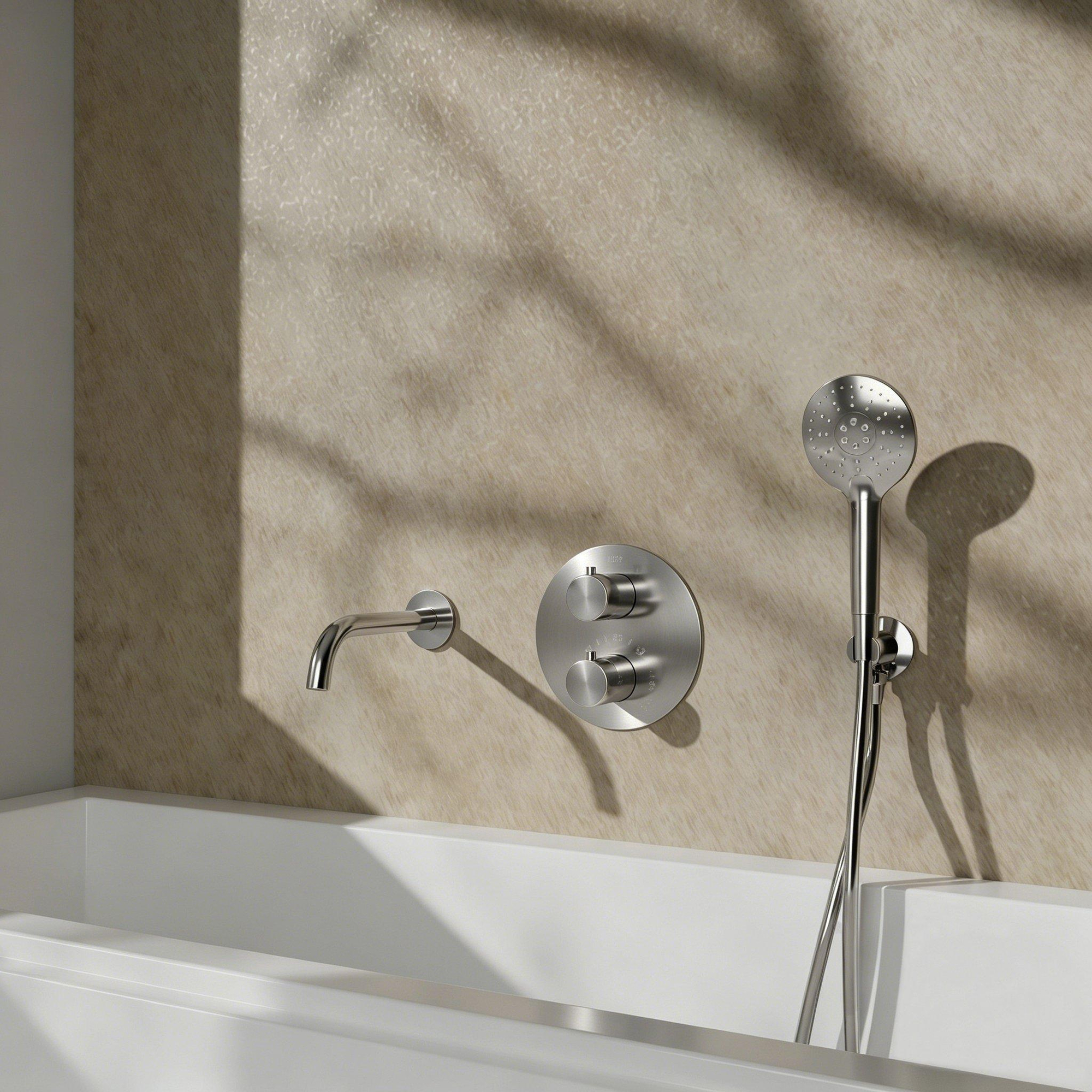 Le set de robinet Fortifura Calvi est conçu avec une apparence moderne qui s'intègre parfaitement dans les salles de bain contemporaines. Les lignes épurées et le design minimaliste donnent un sentiment de raffinement et de simplicité. La finition en acier inoxydable brossé ajoute une touche d'élégance à l'espace, tandis que le bec de 22 cm réductible et la pratique douchette ronde assurent un confort et une commodité ultimes lors de la douche ou du bain.