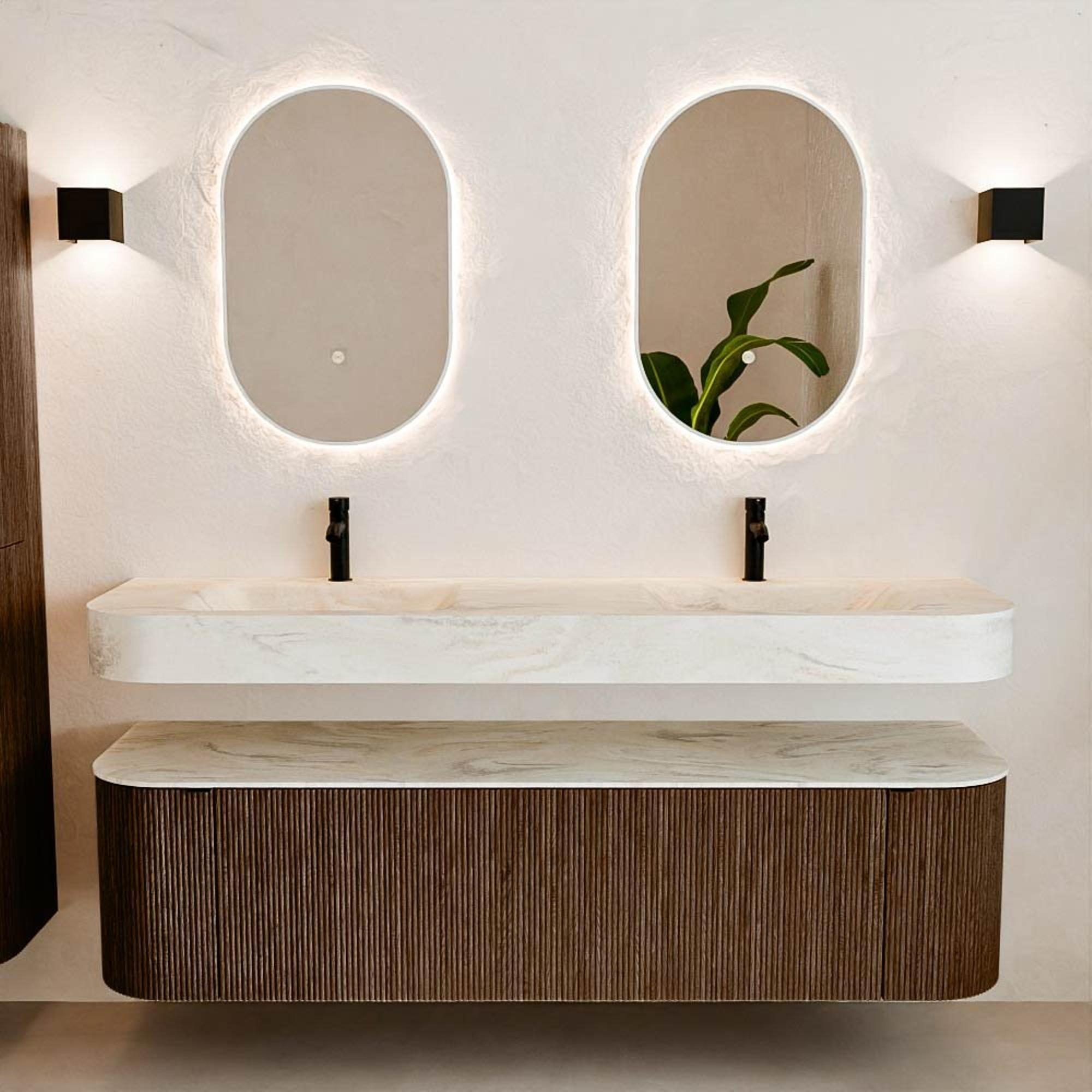 Matériaux naturels dans des tons chauds. Les nervures verticales apportent rythme et texture au design, tandis que le chêne confère une apparence chaleureuse et artisanale. Choisissez parmi 5 teintes de bois OAK, WALNUT, DUSK, SHADOW et RUBY, des couleurs de bois soigneusement sélectionnées pour enrichir les salles de bains modernes et classiques.
