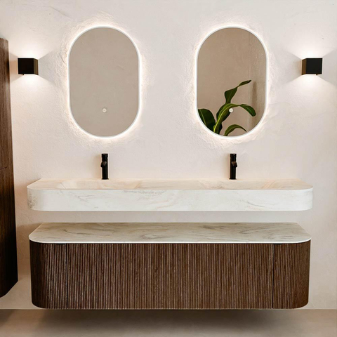 MONDIAZ THOR-DLUX 170cm meuble de salle de bains arrondi gauche + droite couleur Walnut avec 1 tiroir et 2 portes. Vasque suspendue CLOUD Double 2 trous de robinet couleur Ostra.