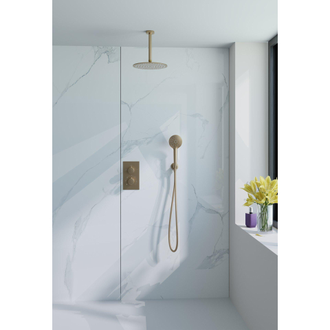Fortifura Calvi Ensemble de douche à encastrer - thermostatique - bras plafond - douche principale de 30 cm - douchette ronde - flexible de douche lisse - Laiton brossé PVD (Or)