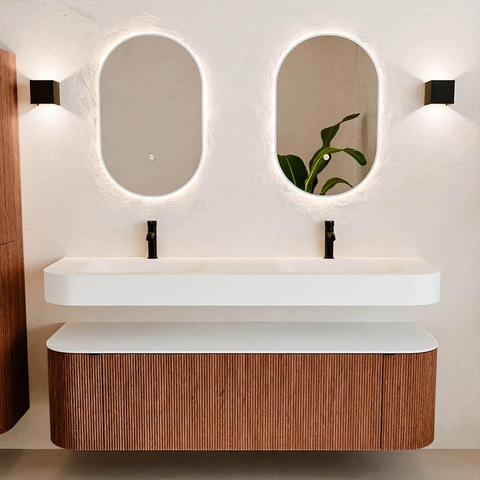 Matériaux naturels dans des tons chauds. Les rainures verticales apportent rythme et texture au design, tandis que le chêne confère une apparence chaleureuse et artisanale. Choisissez parmi 5 teintes de bois OAK, WALNUT, DUSK, SHADOW et RUBY, des couleurs de bois soigneusement sélectionnées pour enrichir les salles de bains modernes et classiques.
