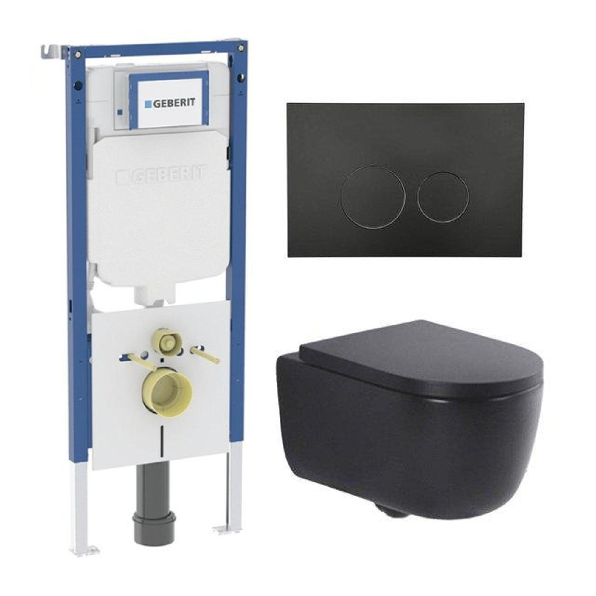 QeramiQ Dely Swirl Pack WC - 36,3x51,7cm - réservoir encastré Geberit UP720 Duofix Sigma - assise 35mm - plaque de déclenchement noir mat - boutons ronds - noir mat