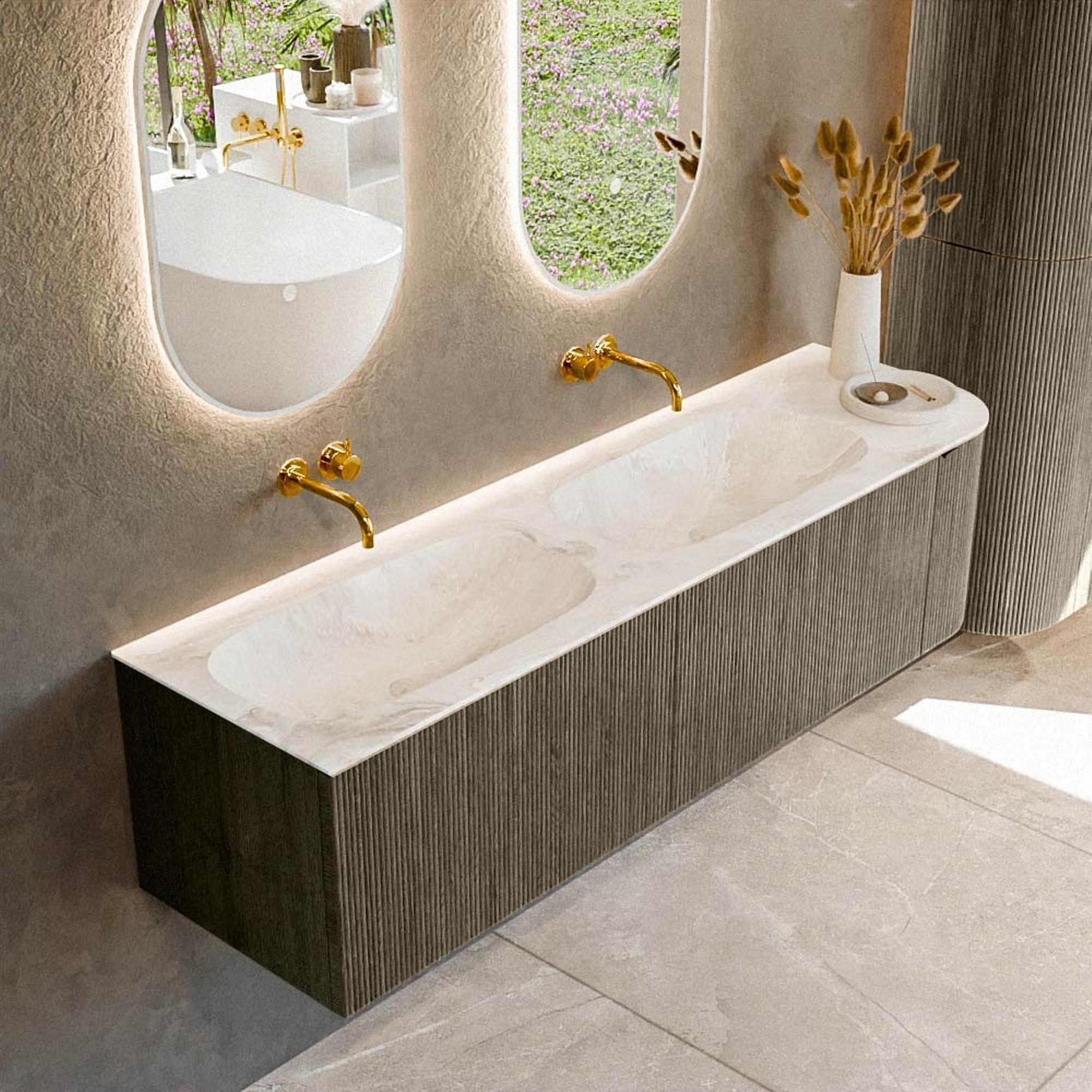 Ensemble de meuble de salle de bain Mondiaz KURVE-DLUX - 165x46x40cm - 2 tiroirs - 1 porte - lavabo en solid surface - double / gauche - sans trou de robinet - Shadow