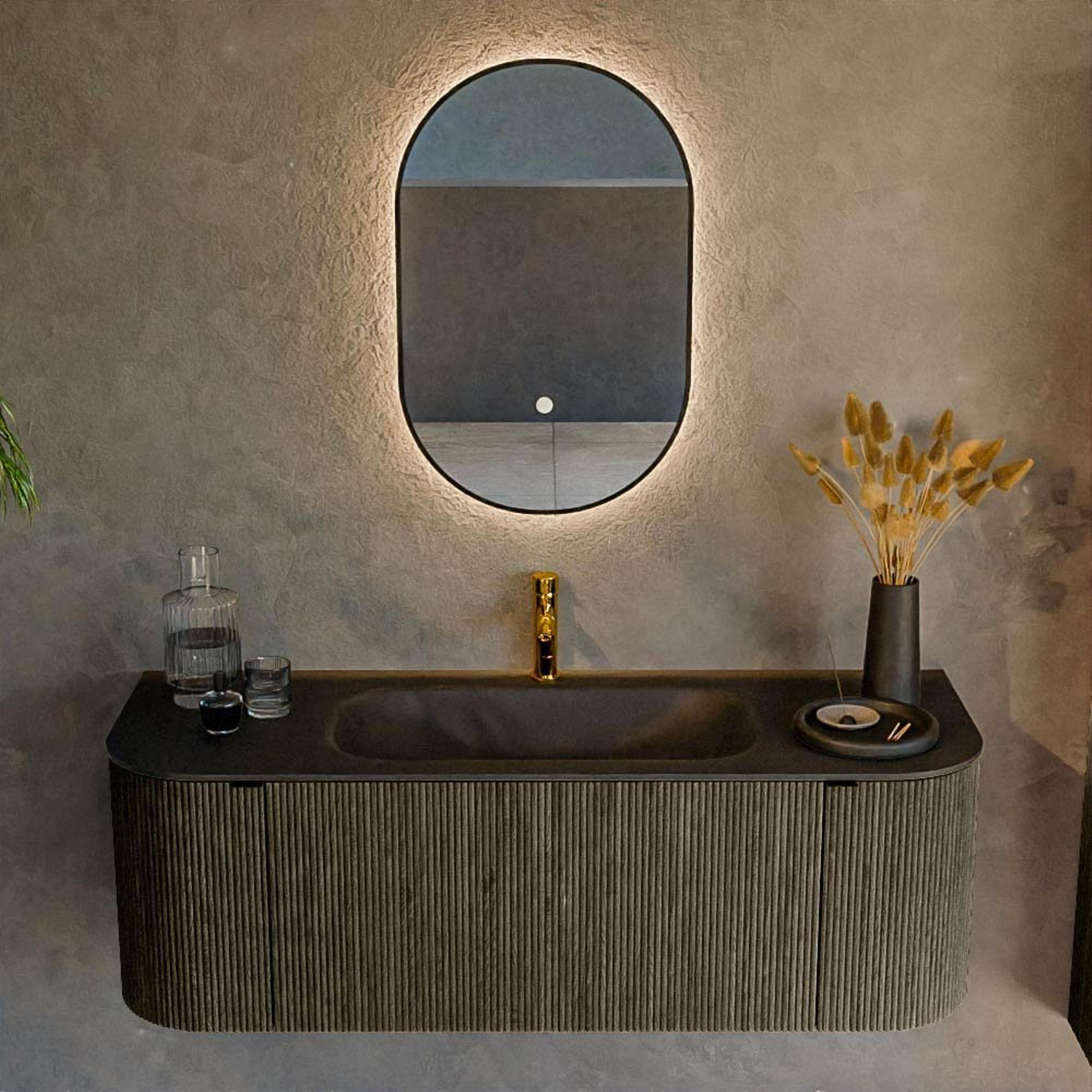 Ensemble de meuble Mondiaz KURVE - 130x46x40cm - 1 tiroir - 2 portes - lavabo en solid surface - centre - 1 trou de robinet - Shadow
