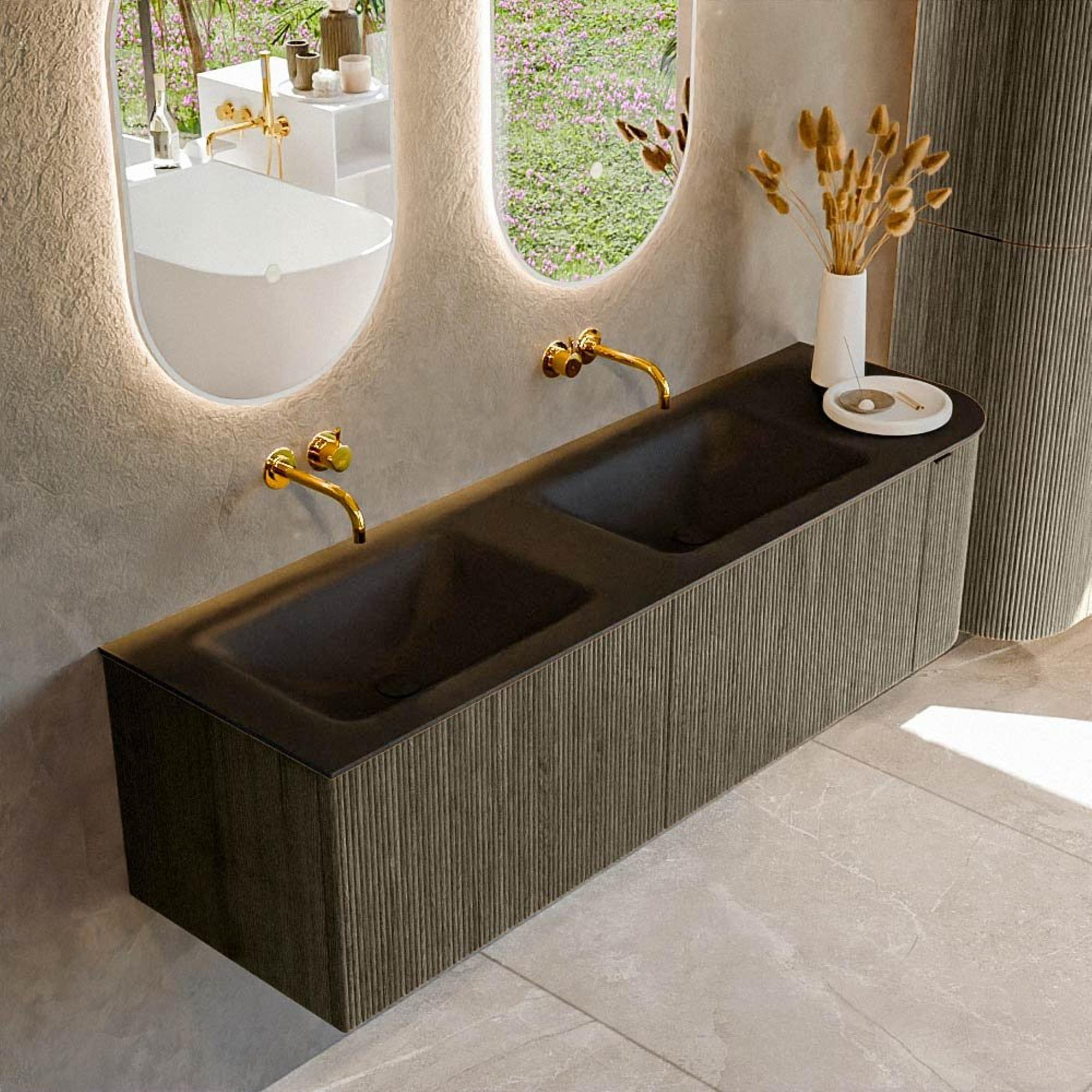 Mondiaz KURVE Ensemble de meuble salle de bain - 155x46x40cm - 2 tiroirs - 1 porte - lavabo en solid surface - double / gauche - sans trou de robinet - Shadow