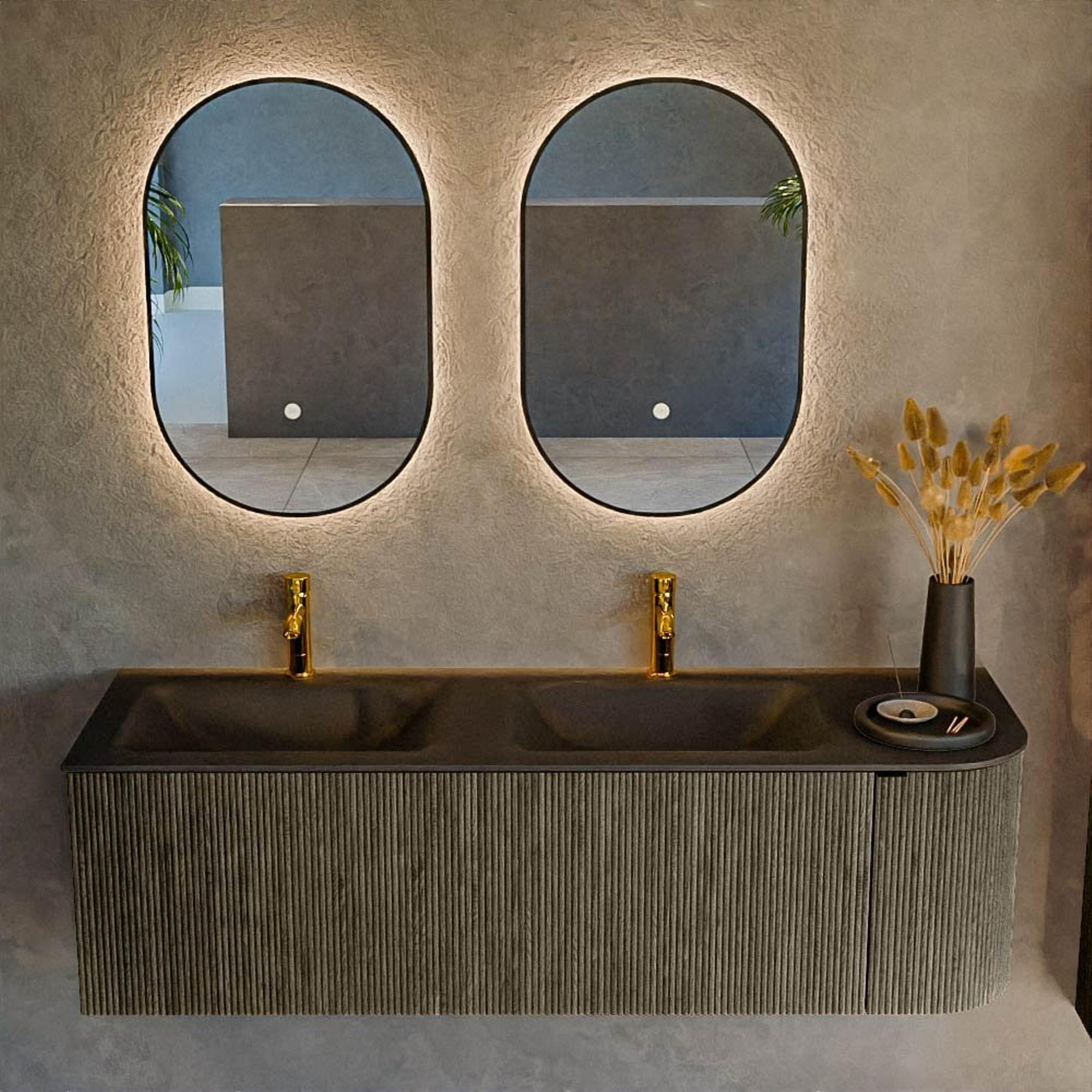 Ensemble de meuble de salle de bain Mondiaz KURVE - 145x46x40cm - 1 tiroir - 1 porte - lavabo en solid surface - double / gauche - 2 trous de robinet - Shadow
