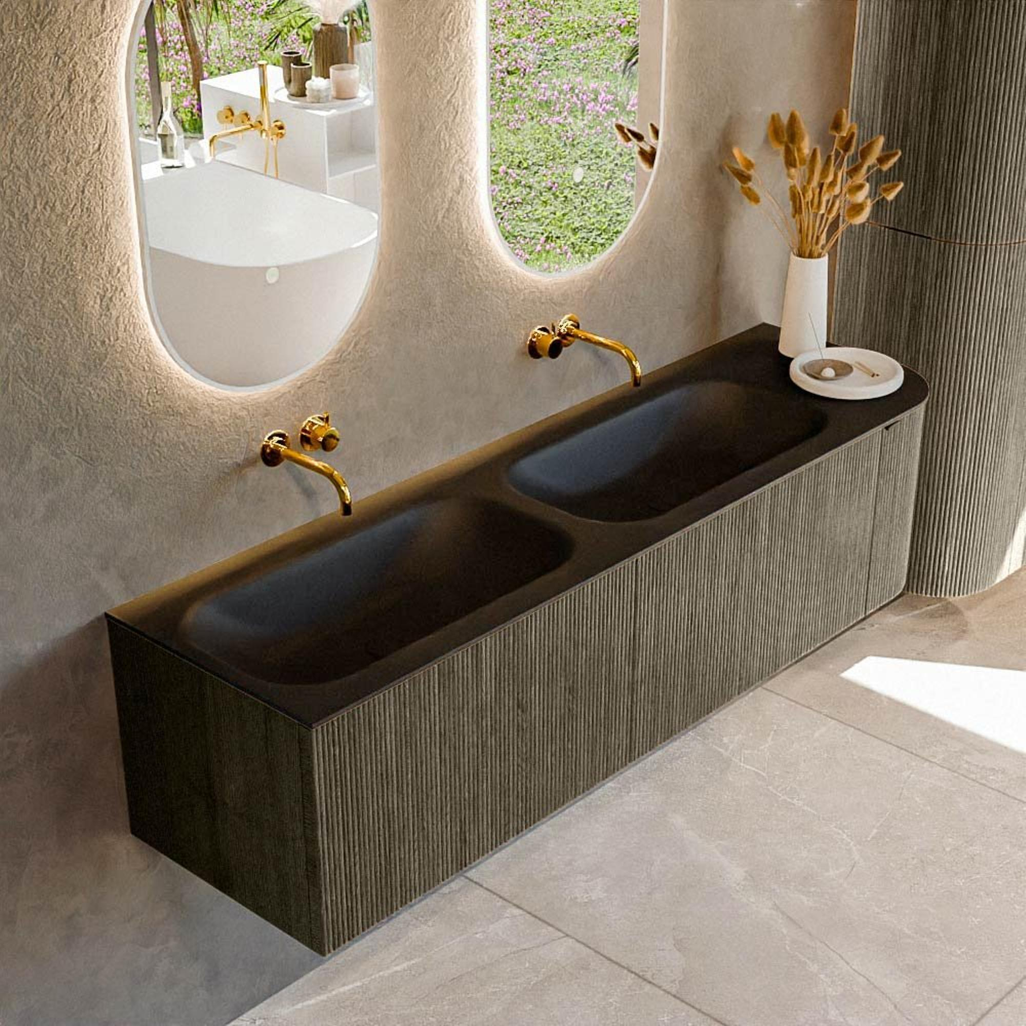 Ensemble de meuble de salle de bain Mondiaz KURVE - 165x46x40cm - 2 tiroirs - 1 porte - lavabo en solid surface - double / gauche - sans trou de robinet - Shadow