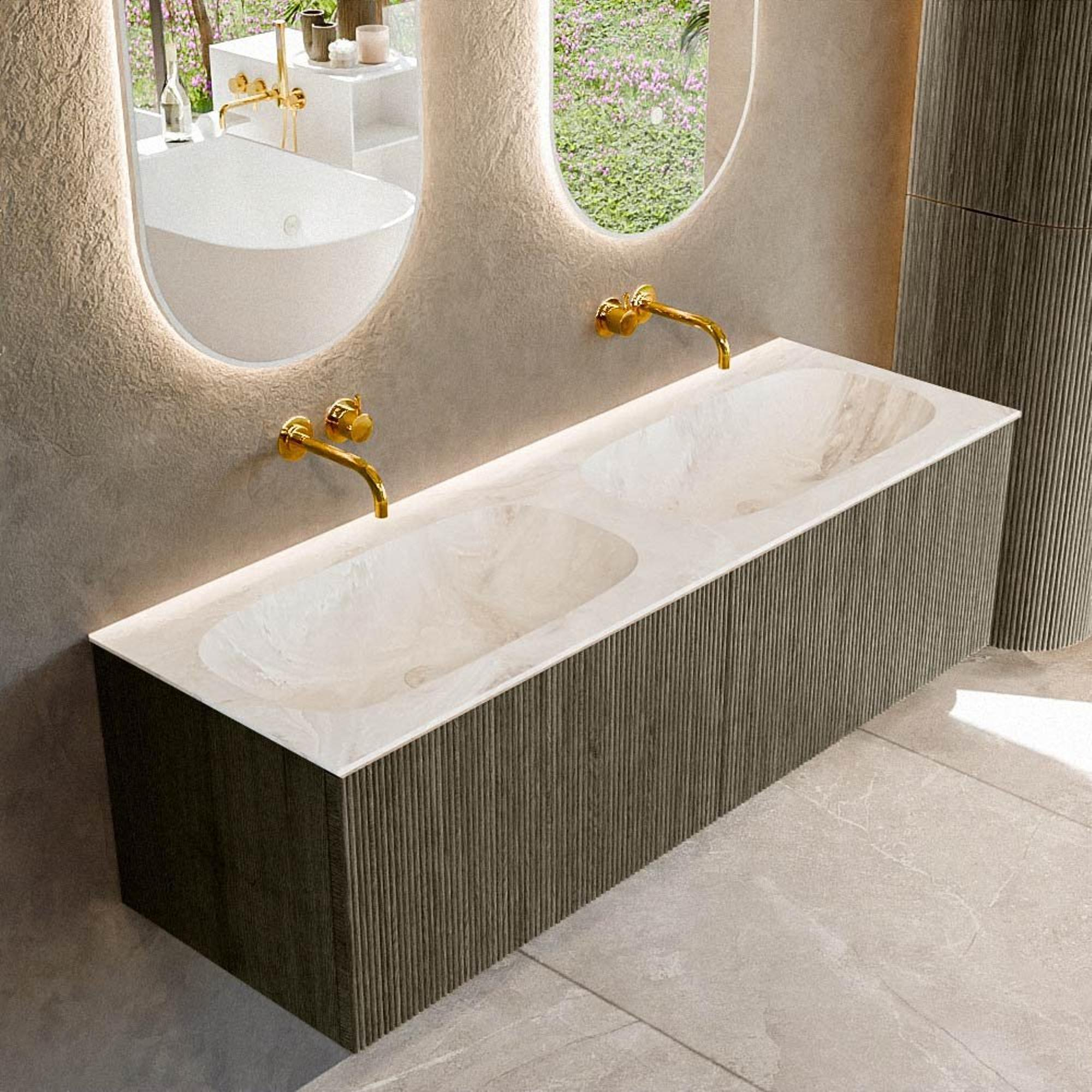 Ensemble de meuble de salle de bain Mondiaz KURVE-DLUX - 140x46x40cm - 2 tiroirs - lavabo en solid surface - double - sans trou de robinet - Shadow