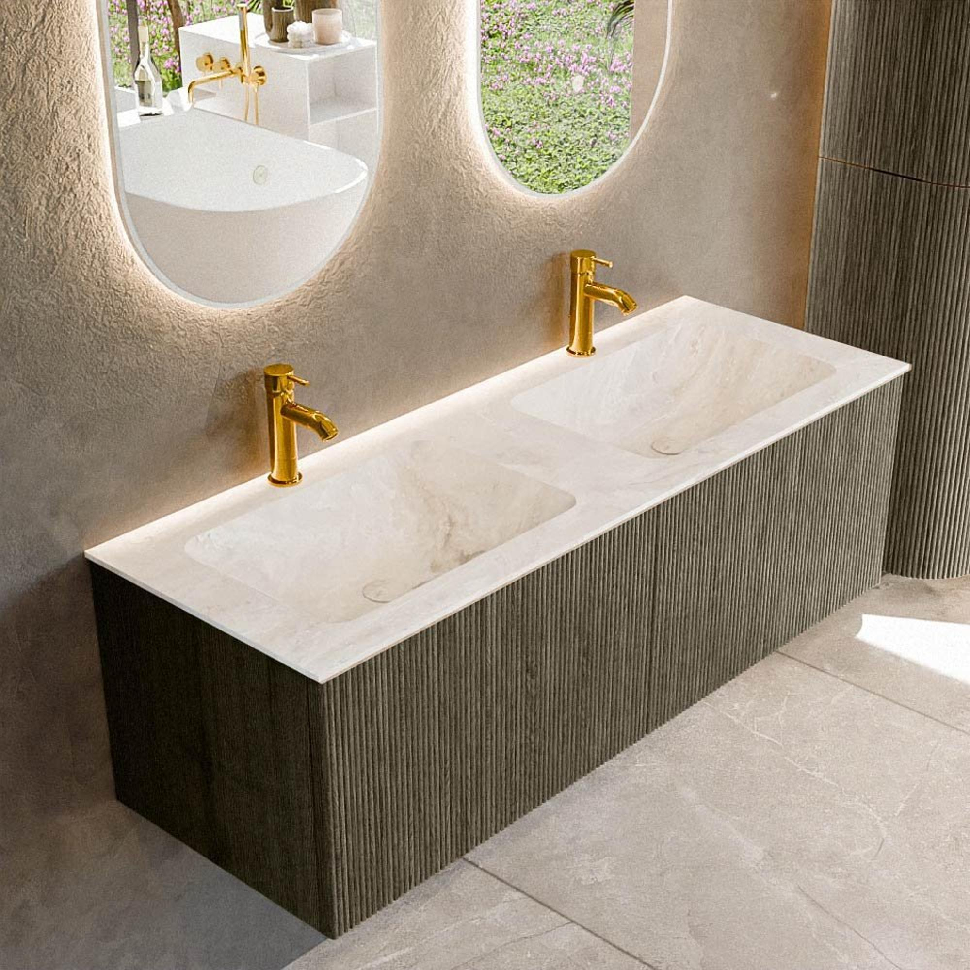 Ensemble de meuble de salle de bain Mondiaz KURVE-DLUX - 130x46x40cm - 2 tiroirs - lavabo en solid surface - double - 2 trous de robinet - Shadow