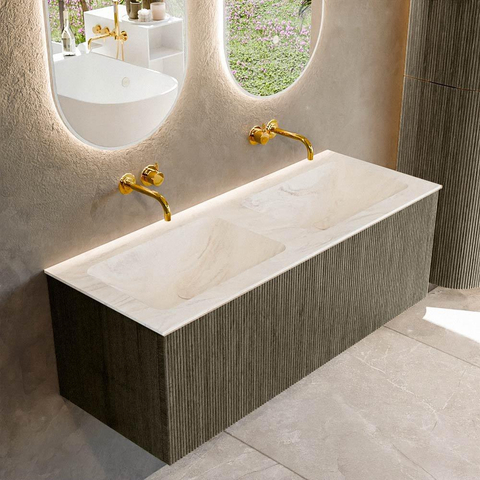 Ensemble de meuble de salle de bain Mondiaz KURVE-DLUX - 120x46x40cm - 1 tiroir - lavabo en solid surface - double - sans trou de robinet - Shadow