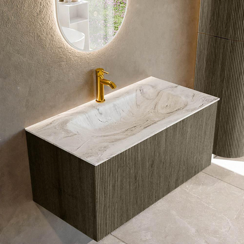 Mondiaz KURVE-DLUX Ensemble de meuble salle de bain - 90x46x40cm - 1 tiroir - lavabo en solid surface - milieu - 1 trou de robinet - Shadow