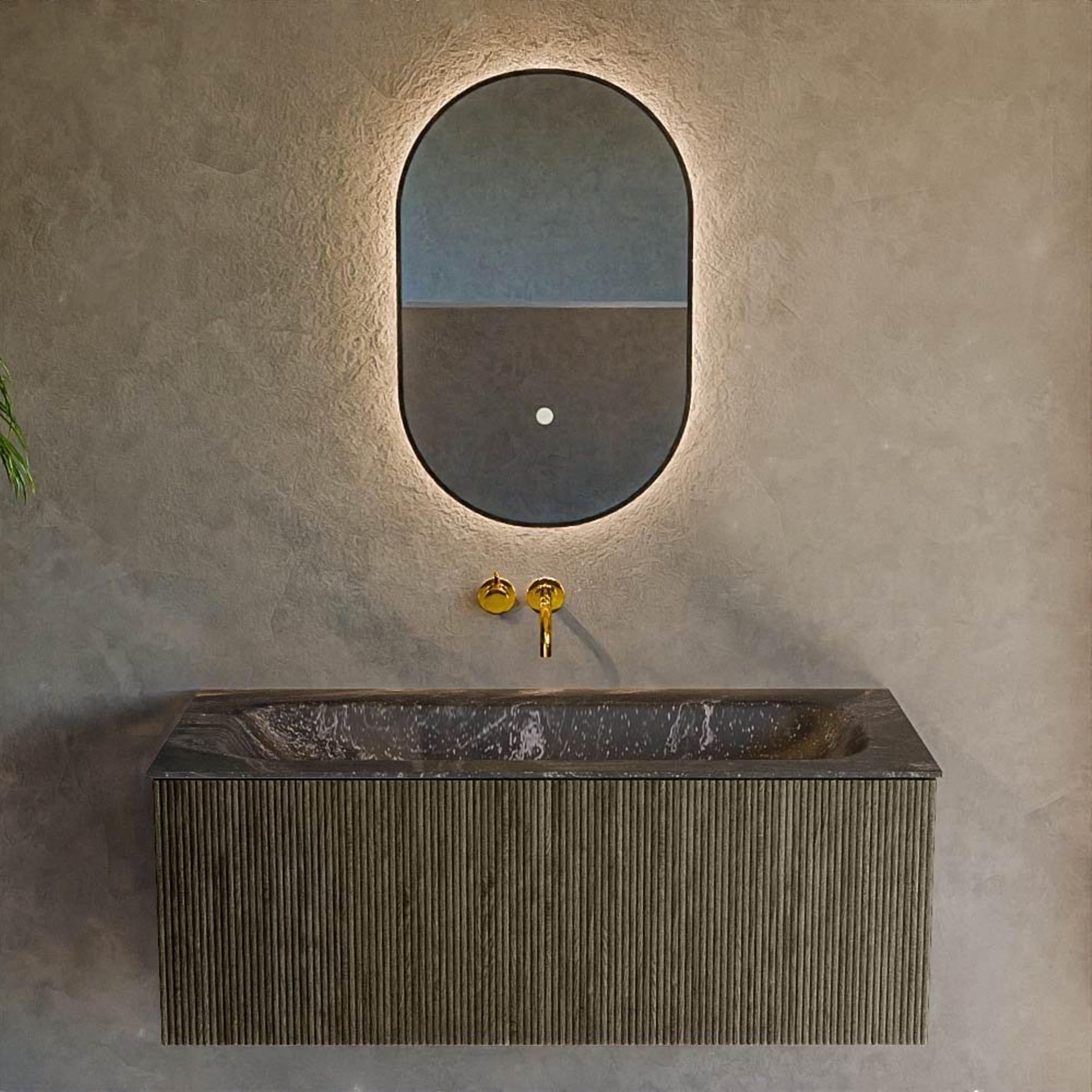 Ensemble de meuble de salle de bain Mondiaz KURVE-DLUX - 110x46x40cm - 1 tiroir - lavabo en solid surface - milieu - sans trou de robinet - Shadow
