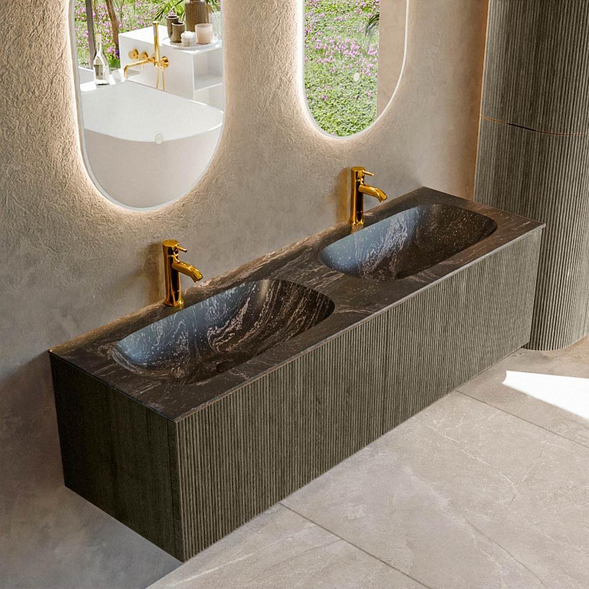 Ensemble de meuble de salle de bain Mondiaz KURVE-DLUX - 150x46x40cm - 2 tiroirs - lavabo en solid surface - double - 2 trous de robinet - Shadow