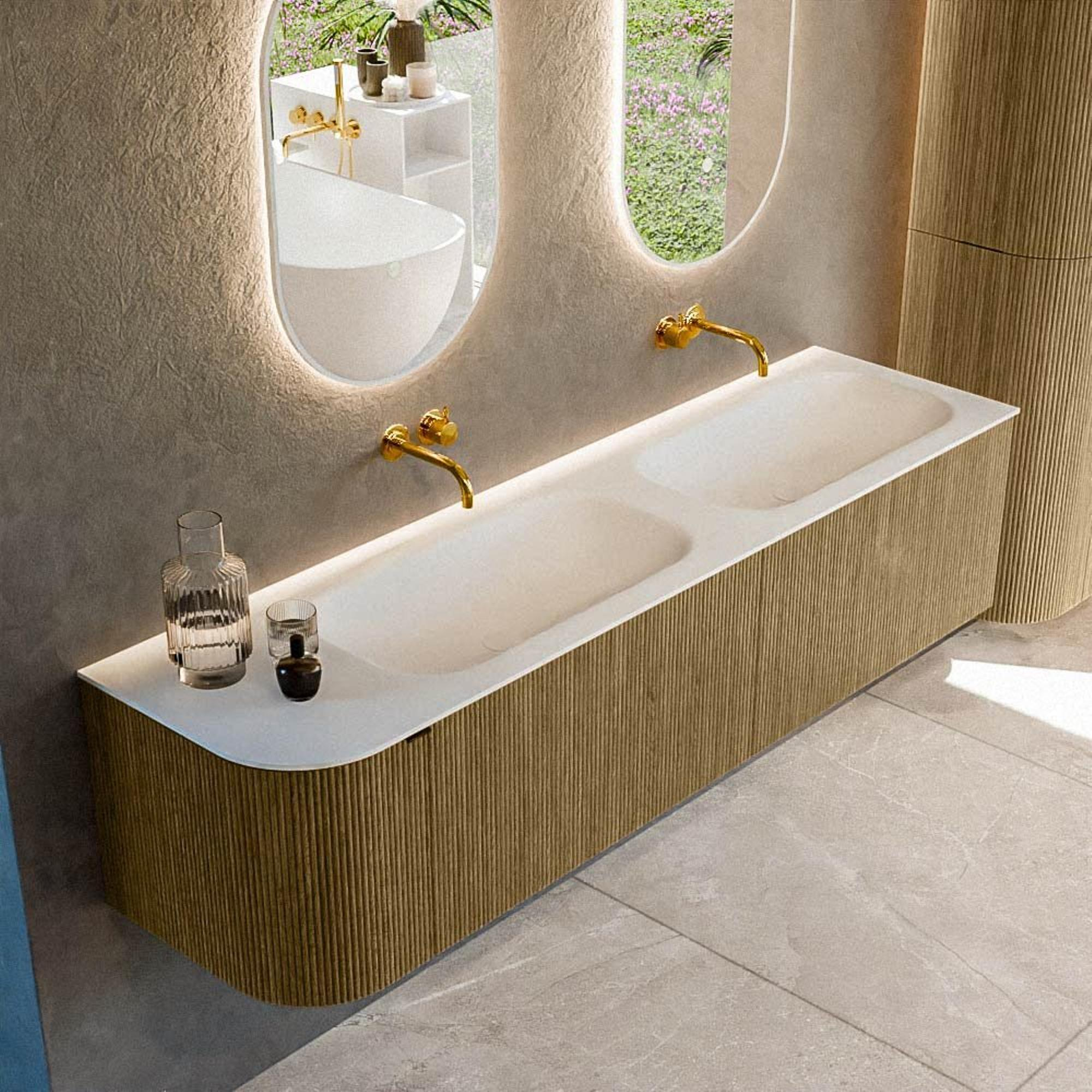 Mondiaz KURVE Ensemble de meuble salle de bain - 175x46x40cm - 2 tiroirs - 1 porte - lavabo en solid surface - double / droite - sans trou de robinet - Dusk