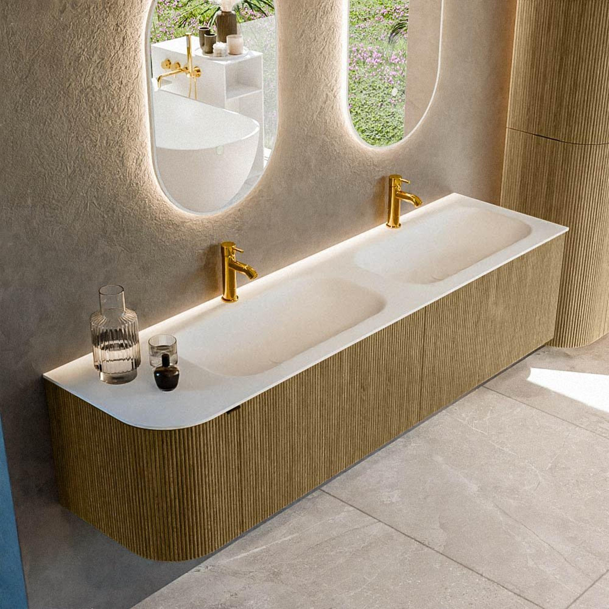 Ensemble de meuble de salle de bain Mondiaz KURVE - 175x46x40cm - 2 tiroirs - 1 porte - lavabo en solid surface - double / droite - 2 trous de robinet - Dusk