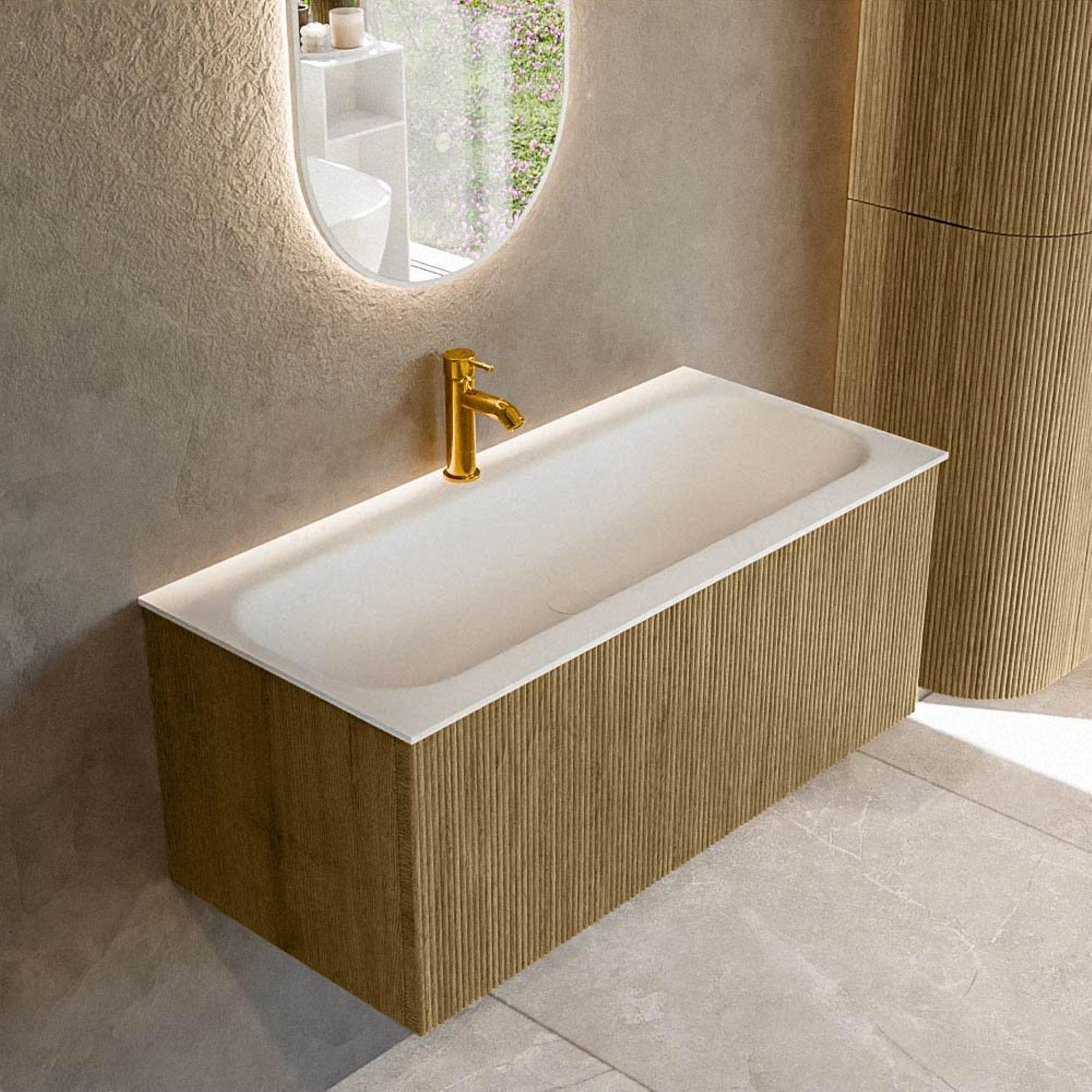 FonctionnelEn plus de son attrait visuel, ce meuble de salle de bain offre également une excellente fonctionnalité. Le tiroir est suffisamment spacieux pour garder tous vos articles de salle de bain essentiels bien rangés et organisés, des produits de soin aux produits de nettoyage. Le lavabo en solid surface est non seulement élégant, mais aussi très durable et facile à nettoyer, ce qui est parfait pour un espace utilisé quotidiennement. Cela garantit que le lavabo conserve sa beauté d'origine, même après une utilisation prolongée. Le seul trou de robinet offre une simplicité significative, tout en améliorant la facilité d'entretien et le confort d'utilisation. De plus, le tiroir glisse en douceur et est équipé d'un mécanisme de fermeture douce, permettant à votre salle de bain de rester calme et silencieuse. Tous ces éléments réunis en font une pièce magnifique qui offre l'harmonie parfaite entre design et facilité d'utilisation, rendant votre salle de bain non seulement belle, mais aussi fonctionnelle.