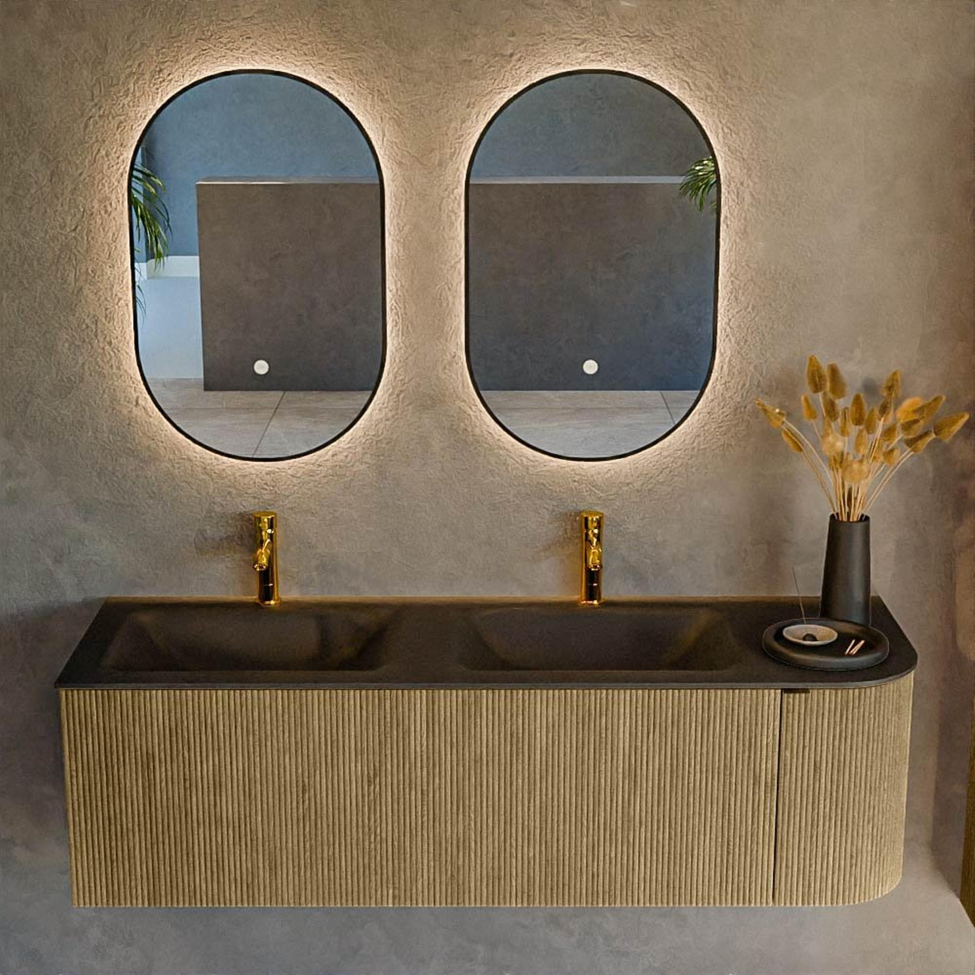 Mondiaz KURVE Ensemble de meuble salle de bain - 145x46x40cm - 1 tiroir - 1 porte - lavabo en solid surface - double / gauche - 2 trous de robinet - Dusk