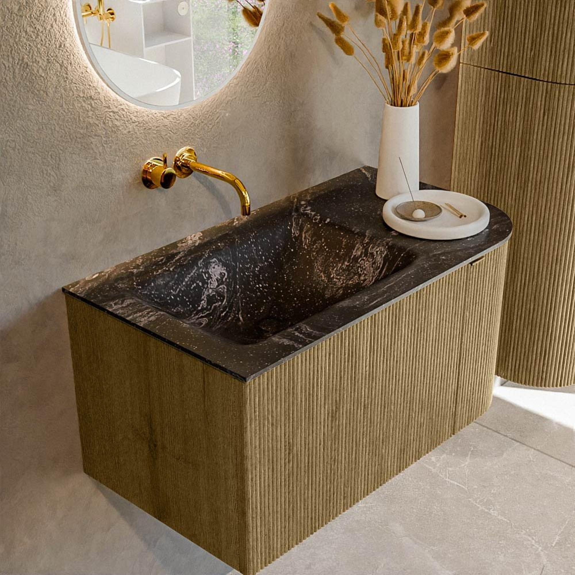 Ensemble de meuble de salle de bain Mondiaz KURVE-DLUX - 85x46x40cm - 1 tiroir - 1 porte - lavabo en solid surface - gauche - sans trou de robinet - Dusk