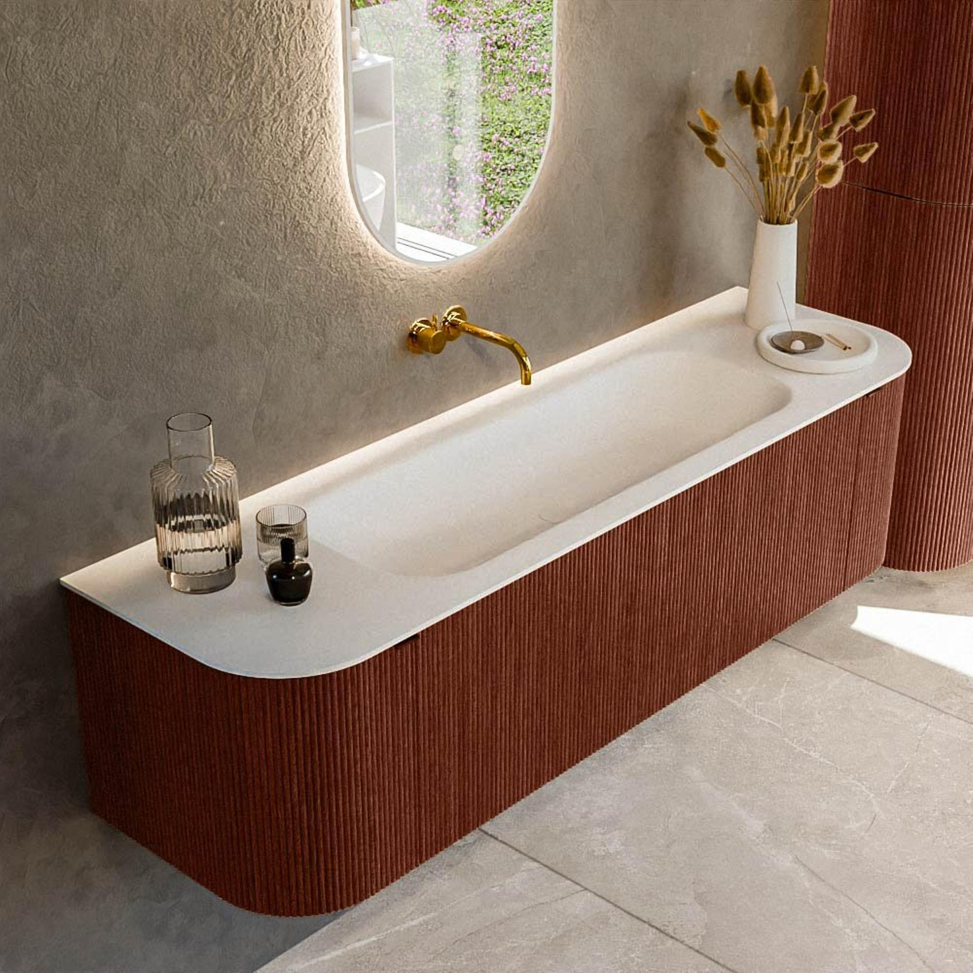 IntemporelUn design intemporel fait de cet ensemble de meuble de salle de bain un classique qui ne se démode jamais. Les lignes épurées et le caractère minimaliste font que le meuble s'intègre sans effort dans divers styles d'intérieur, du moderne au traditionnel. La couleur Ruby donne à l'ensemble une apparence attrayante et chaleureuse, contribuant à l'atmosphère facile à utilisere de la salle de bain. Le matériau solid surface est non seulement durable mais aussi esthétiquement responsable, ce qui lui permet de rester beau plus longtemps et de résister à l'usure quotidienne. Cette combinaison de matériaux et de couleurs avec un design intemporel garantit que votre salle de bain obtienne l'apparence de calme et d'harmonie que vous avez toujours recherchée. Sans tomber dans des tendances éphémères, cet ensemble de meuble de salle de bain offre une élégance qui survivra aux générations, en faisant un investissement précieux pour chaque maison.