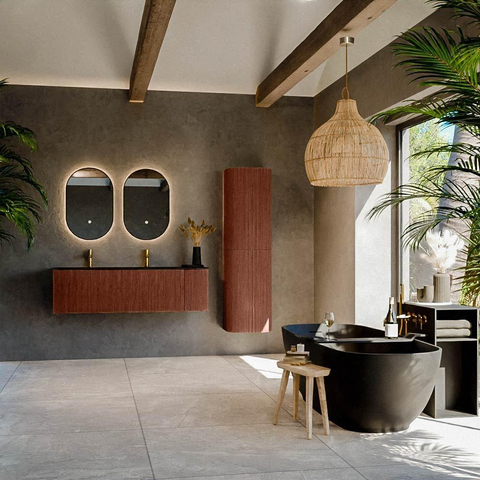 ÉlégantL'élégance de cet ensemble de meuble se dégage de chaque angle et détail. Avec ses dimensions généreuses et son design épuré, il parvient à créer un équilibre parfait entre fonctionnalité et beauté. La finition raffinée et le choix de matériaux solides assurent une apparence intemporelle qui s'adapte facilement aux styles de salle de bain modernes et traditionnels. La surface du lavabo est en solid surface, un matériau connu pour sa sensation luxueuse et sa capacité à mettre en valeur l'élégance de chaque design. Le choix de couleur subtil mais puissant, Ruby, offre une atmosphère chaleureuse et accueillante, invitant chaque visiteur de la salle de bain à ressentir un sentiment de luxe et de sérénité. C'est cette rare combinaison de simplicité et de raffinement qui définit le design de ce meuble. Le tiroir et la porte généreux offrent non seulement une attraction esthétique mais aussi un charme pratique, garantissant que votre salle de bain reste toujours rangée et stylée. Chaque fois que vous regardez ce meuble, vous vous rappelez le raffinement qu'il ajoute à votre maison, vous rendant fier de vos choix. La disposition de deux trous de robinet contribue également à la sensation d'équilibre et de symétrie qui enveloppe l'ensemble du meuble. Avec ce design, vous avez une pièce intemporelle qui résiste sans effort à l'épreuve du temps et sera toujours un point central d'élégance dans votre salle de bain.