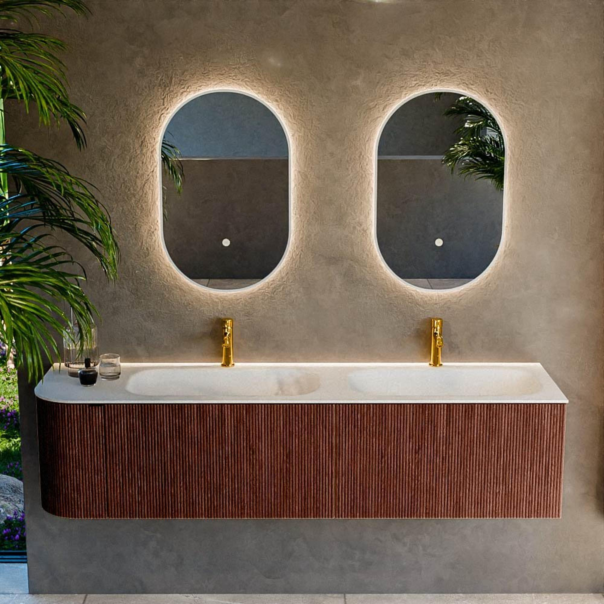 Ensemble de meuble de salle de bain Mondiaz KURVE - 175x46x40cm - 2 tiroirs - 1 porte - lavabo en solid surface - double / droite - 2 trous de robinet - Ruby