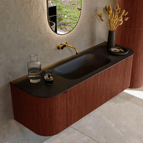 Imaginez un meuble de salle de bain qui est la combinaison parfaite de style et de fonctionnalité, conçu pour enrichir vos routines quotidiennes et transformer votre salle de bain en une oasis de tranquillité. Ce meuble a une apparence raffinée, soulignée par ses lignes épurées et son design élégant. Avec une largeur généreuse de 140 cm, il offre suffisamment d'espace pour tous vos articles de toilette, tout en conservant une présence esthétiquement calme. Le lavabo en matériau solid surface rayonne de durabilité et de qualité, une caractéristique qui se remarque immédiatement à chaque contact. Le meuble est réalisé dans une magnifique couleur Ruby, qui ajoute chaleur et luxe à votre intérieur de salle de bain. Malgré son apparence moderne, des accents classiques subtils sont présents, assurant un attrait intemporel. Le design sans trou de robinet offre de l'espace pour une configuration de robinet créative selon vos souhaits et s'adapte à tous les styles de salle de bain. Le placement central du lavabo crée un équilibre harmonieux et rend le meuble accueillant et facilement accessible. À l'intérieur, il y a des possibilités de rangement cachées qui sont non seulement pratiques, mais contribuent également à une salle de bain bien rangée. Combinez cette esthétique avec les matériaux les plus raffinés et vous avez un meuble qui rend votre salle de bain un endroit particulier.