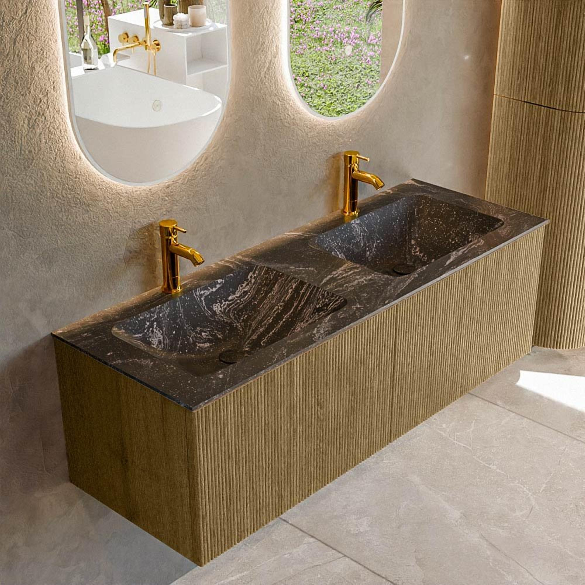 Ensemble de meuble de salle de bain Mondiaz KURVE-DLUX - 130x46x40cm - 2 tiroirs - lavabo en solid surface - double - 2 trous de robinet - Dusk
