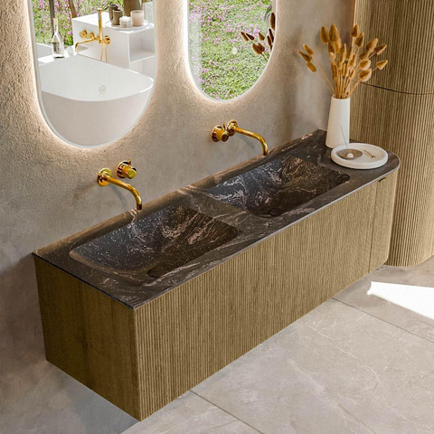 Ensemble de meuble de salle de bain Mondiaz KURVE-DLUX - 145x46x40cm - 1 tiroir - 1 porte - lavabo en solid surface - double / gauche - sans trou de robinet - Dusk
