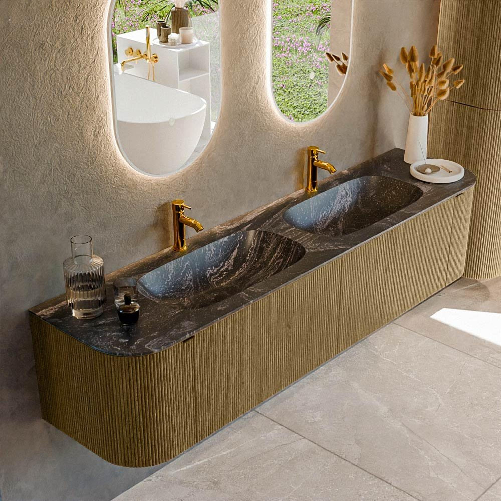 Ensemble de meuble de salle de bain Mondiaz KURVE-DLUX - 190x46x40cm - 2 tiroirs - 2 portes - lavabo en solid surface - double - 2 trous de robinet - Dusk