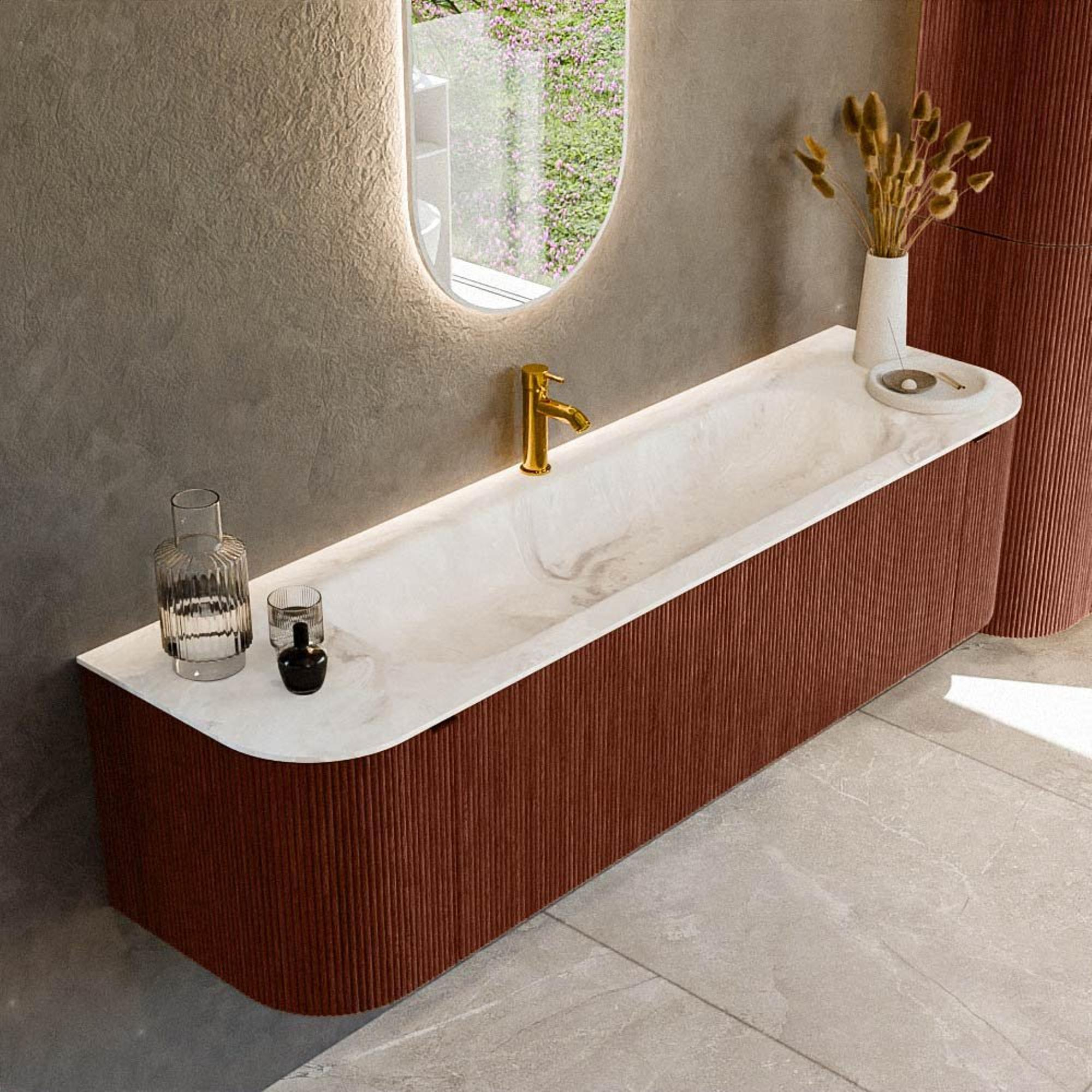 ÉlégantLe design de cet Ensemble de meuble est un modèle d'élégance, avec un équilibre subtil entre éléments classiques et modernes. Les lignes épurées et la finition lisse confèrent une apparence raffinée, tandis que la couleur particulière Ruby offre un accent chaleureux qui adoucit visuellement l'espace. La finition élégante du lavabo en solid surface, intégré de manière transparente dans le design, contribue à l'apparence polie de l'ensemble. Grâce à l'utilisation de matériaux de qualité et de techniques de production artisanales, chaque détail reçoit l'attention qu'il mérite, des contours fins du tiroir sans poignée aux charnières cachées des portes. L'élégance de ce meuble ne se limite pas seulement à l'aspect visuel ; sa fonction pratique reflète également une approche réfléchie et rationalisée du design de salle de bain. Cela en fait non seulement un atout esthétique, mais aussi un choix fonctionnel qui constitue un ajout harmonieux à tout environnement de salle de bain.