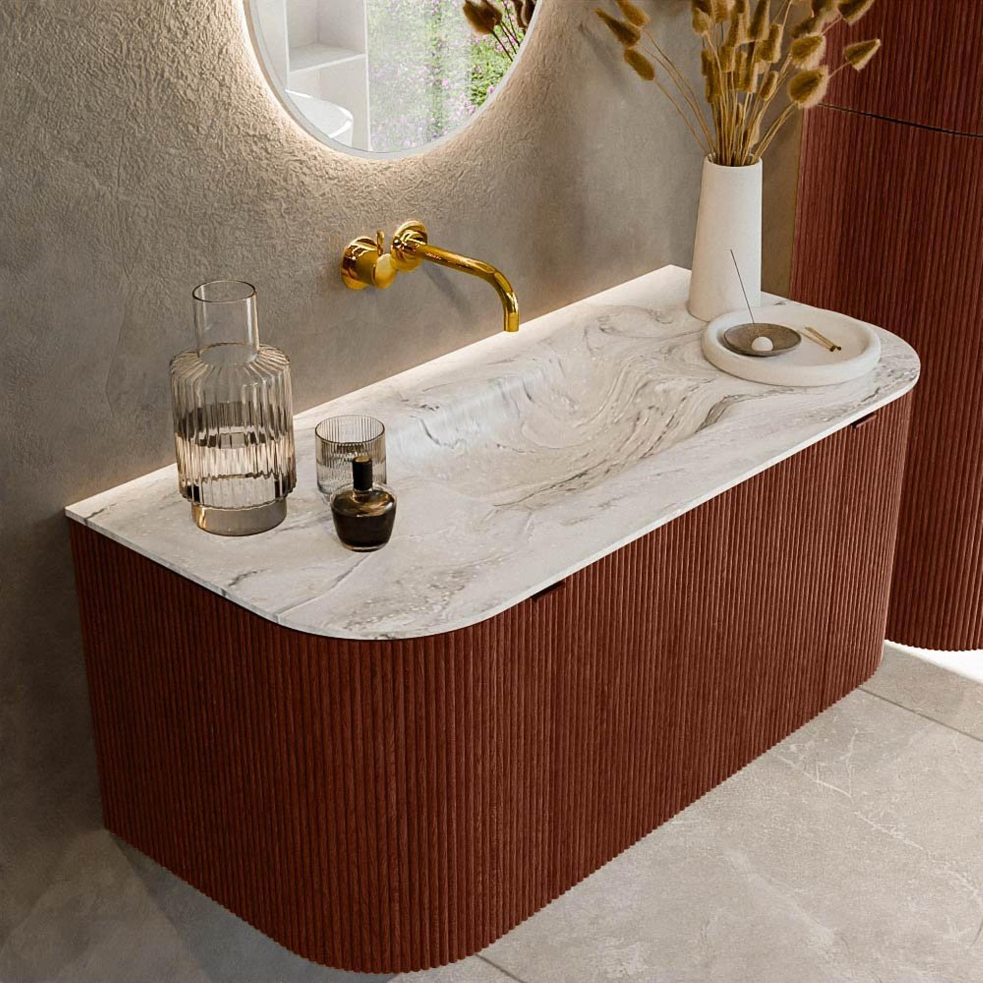 Ensemble de meuble de salle de bain Mondiaz KURVE-DLUX - 100x46x40cm - 1 tiroir - 2 portes - lavabo en solid surface - milieu - sans trou de robinet - Ruby