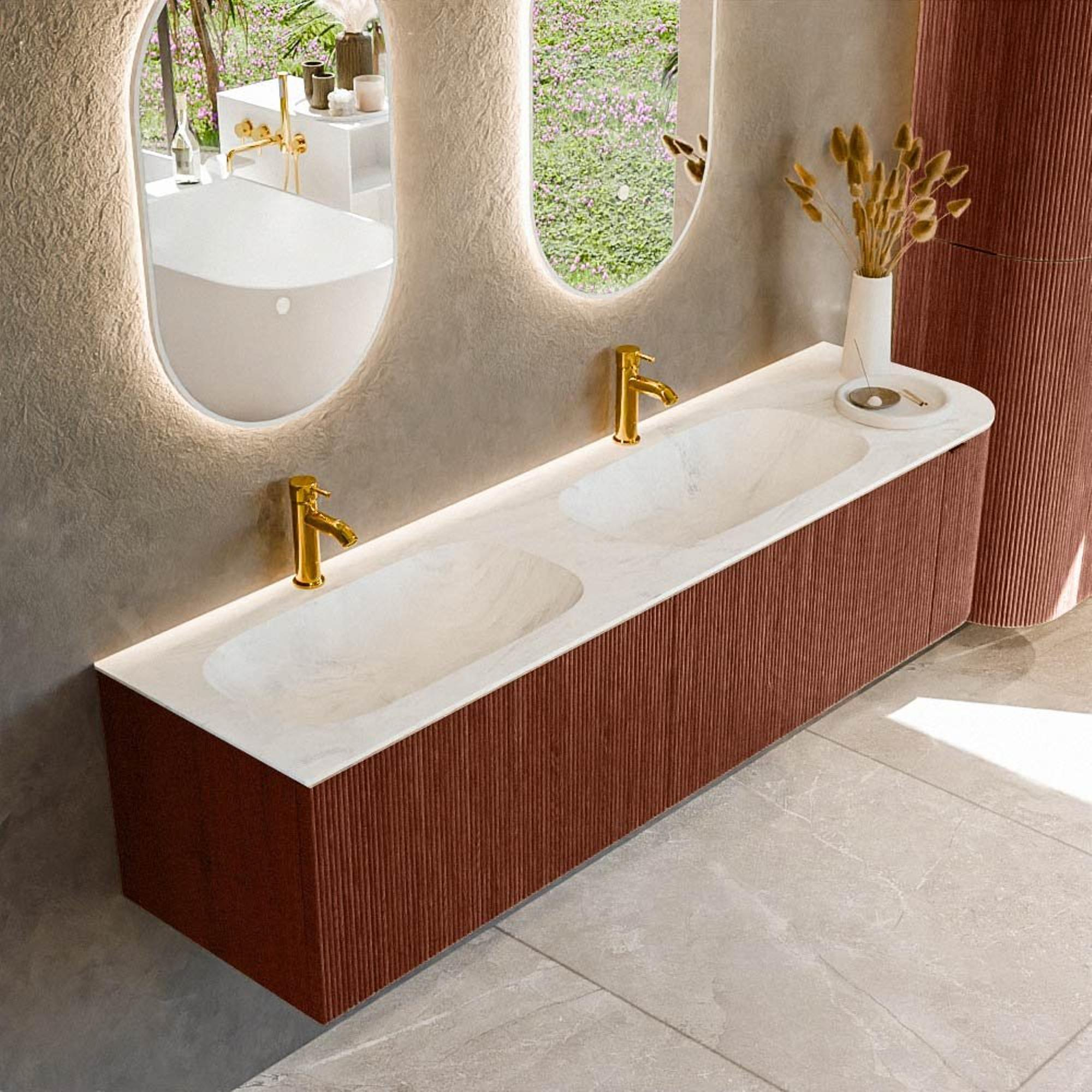 Mondiaz KURVE-DLUX Ensemble de meuble salle de bain - 175x46x40cm - 2 tiroirs - 1 porte - lavabo en solid surface - double / gauche - 2 trous de robinet - Ruby
