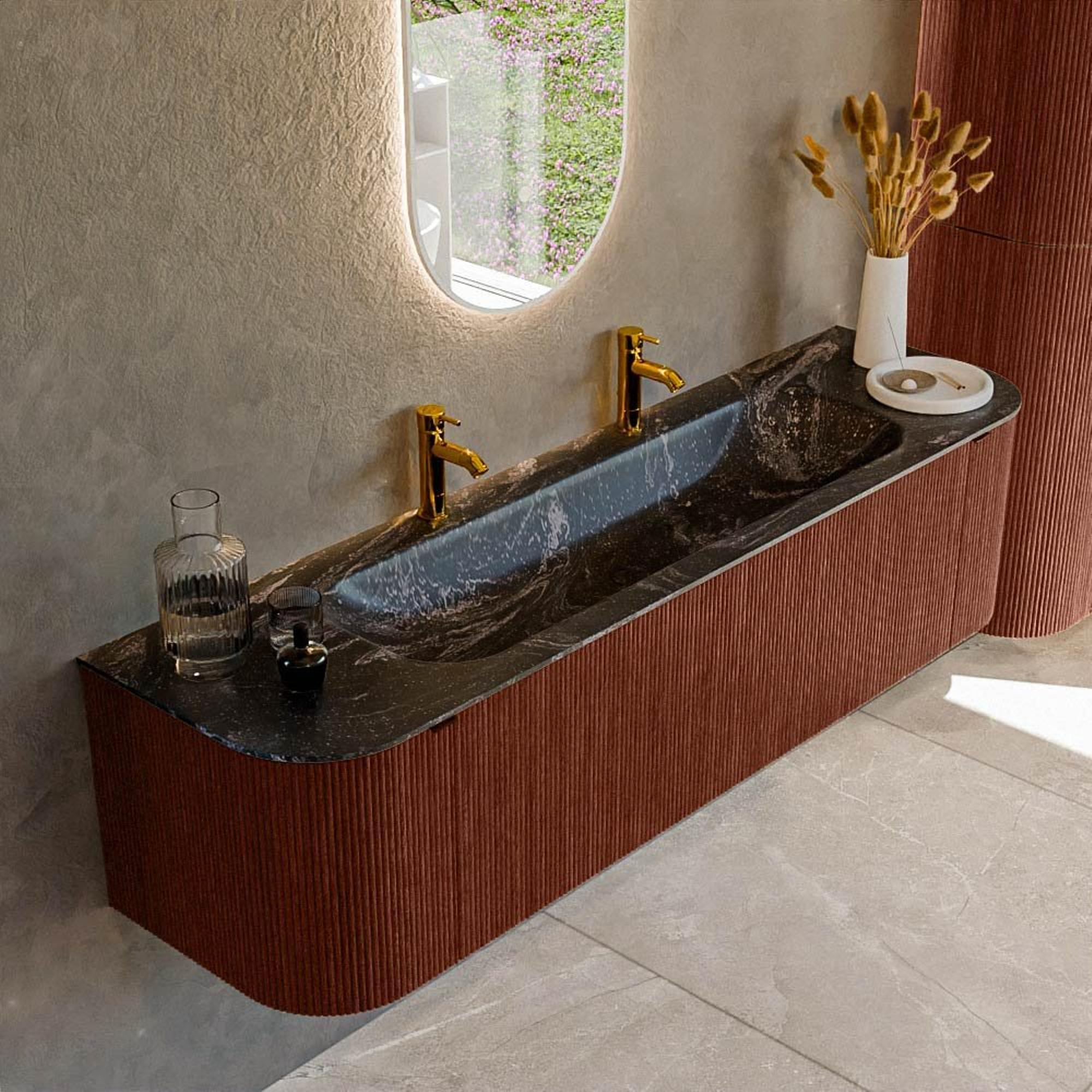 Ensemble de meuble de salle de bain Mondiaz KURVE-DLUX - 170x46x40cm - 1 tiroir - 2 portes - lavabo en solid surface - milieu - 2 trous de robinet - Ruby