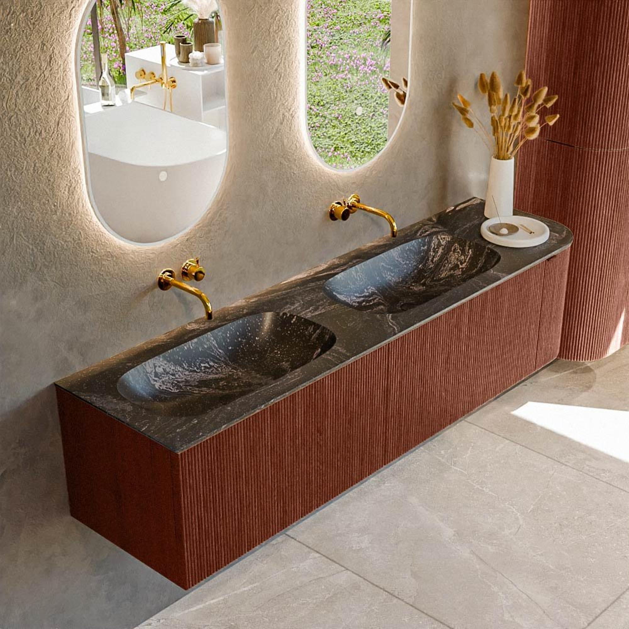 Ensemble de meuble de salle de bain Mondiaz KURVE-DLUX - 175x46x40cm - 2 tiroirs - 1 porte - lavabo en solid surface - double / gauche - sans trou de robinet - Ruby
