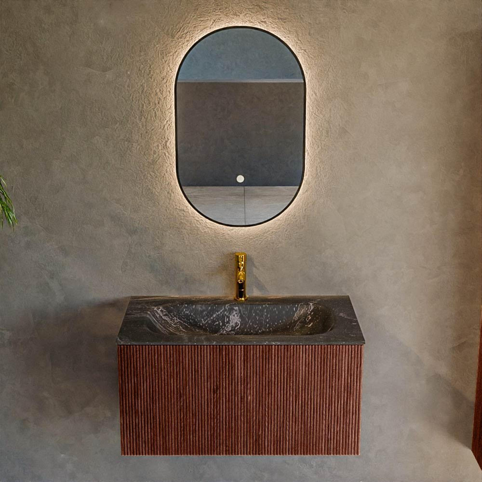 ÉlégantL'élégance de ce meuble de salle de bain n'est pas seulement visible mais aussi palpable. Le design épuré crée une apparence calme qui apporte équilibre et harmonie à votre salle de bain. La finition subtile et le choix d'une teinte plus profonde donnent une apparence raffinée. Les formes lisses du lavabo sont exceptionnellement élégantes et dégagent un certain luxe, ce qui signifie que vous créez un espace à la fois accueillant et relaxant. Cette élégance est encore soulignée par les matériaux de haute qualité utilisés dans la production du meuble. Les matériaux de solid surfaces non seulement offrent une apparence luxueuse, mais sont également conçus pour résister à l'épreuve du temps, vous permettant de profiter pendant des années de cette beauté esthétique dans votre salle de bain.