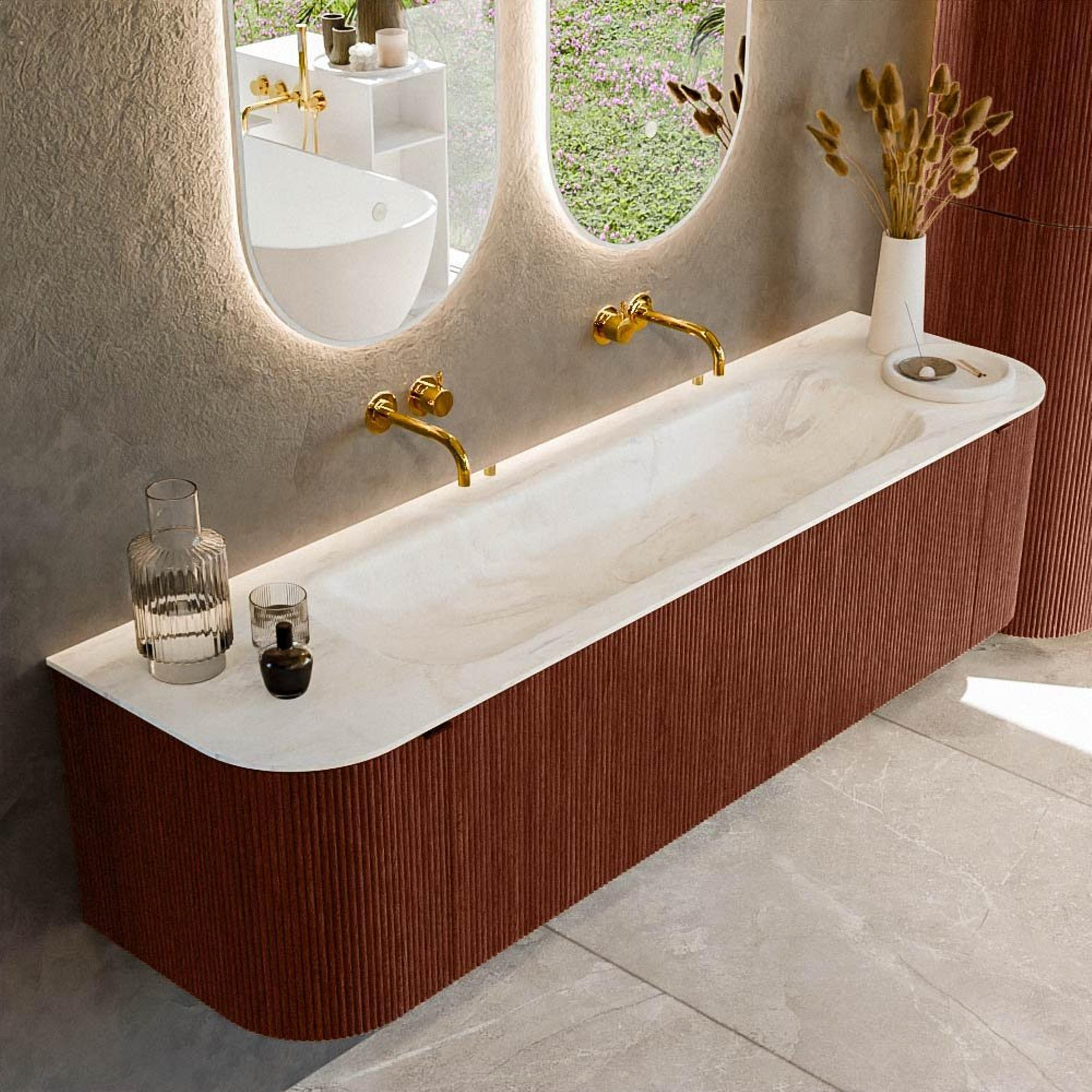 Ensemble de meuble de salle de bain Mondiaz KURVE-DLUX - 170x46x40cm - 1 tiroir - 2 portes - lavabo en solid surface - milieu - sans trou de robinet - Ruby