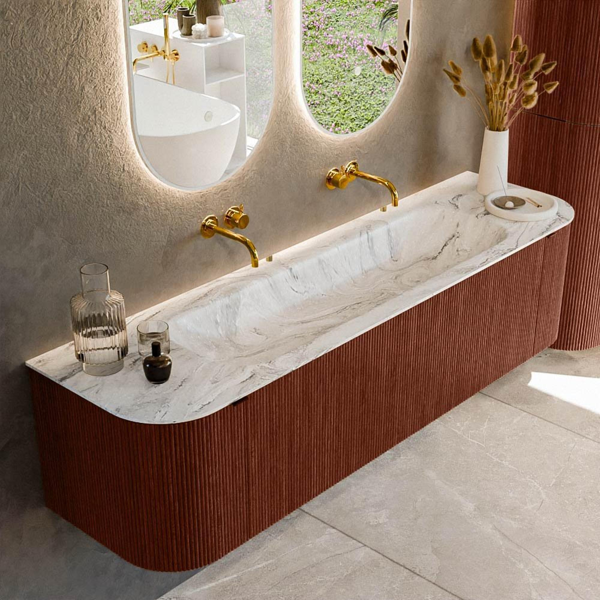 Ensemble de meuble de salle de bain Mondiaz KURVE-DLUX - 170x46x40cm - 1 tiroir - 2 portes - lavabo en solid surface - milieu - sans trou de robinet - Ruby