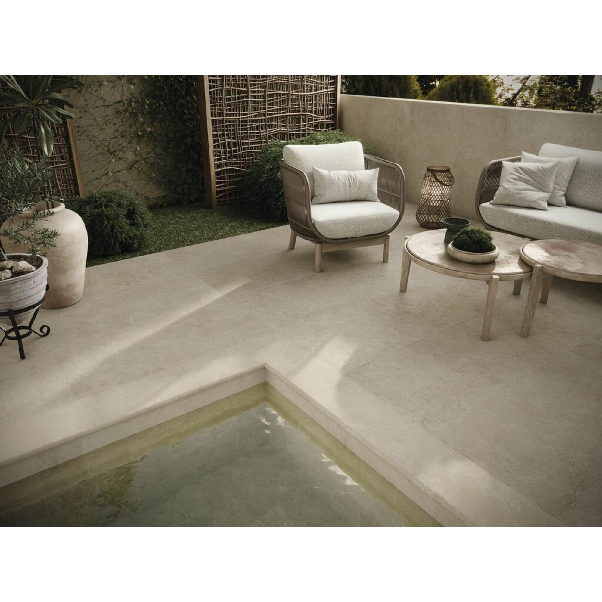 Pour une dalle d'extérieur, la sécurité est tout aussi importante que l'apparence. Ce carrelage possède une couche de surface mate combinée à une valeur antidérapante R11, ce qui offre une adhérence supplémentaire, même lorsque le sol est mouillé par la pluie ou la condensation. Ce choix est donc particulièrement adapté aux situations où vous marchez souvent pieds nus ou avec des chaussures mouillées, comme autour d'une piscine, près d'une douche extérieure ou directement à la porte du jardin. La couleur beige avec aspect pierre naturelle donne à votre terrasse une apparence chaude et naturelle, tandis que la finition mate évite les reflets gênants dus au soleil. Vous combinez ainsi un revêtement de sol extérieur sûr et fonctionnel avec une apparence qui s'intègre parfaitement aux styles de jardin modernes, méditerranéens ou scandinaves.