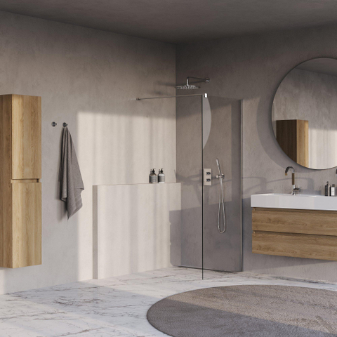Avec une largeur de 80 cm et une hauteur de 200 cm, cette douche à l’italienne offre suffisamment d’espace pour une douche confortable sans éclaboussures hors de la zone de douche. La paroi fixe est facile à monter et grâce à la barre de stabilisation, elle est stable et sûre. Le revêtement verre fait que l’eau et la saleté adhèrent moins rapidement, ce qui simplifie l’entretien. Ainsi, vous combinez facilement facilité d’utilisation et design épuré, exactement ce que vous cherchez dans une solution de salle de bains moderne.