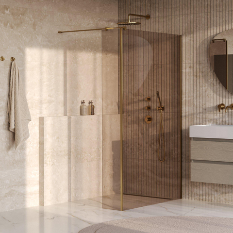 Cette douche à l’italienne dégage une pure élégance grâce à l’utilisation de verre couleur bronze combiné à une finition PVD or brossé. Le subtil jeu de couleurs donne à votre salle de bains une apparence chaude et luxueuse, intemporelle. Les lignes épurées et le verre plat offrent un look moderne et minimaliste, parfaitement adapté à différents styles d’intérieur. Ainsi, vous créez une salle de bains non seulement fonctionnelle, mais aussi un véritable point fort visuel. Avec cette douche stylée, vous faites un choix conscient pour le design et l’ambiance, faisant de votre salle de bains un lieu où vous aimez passer du temps.