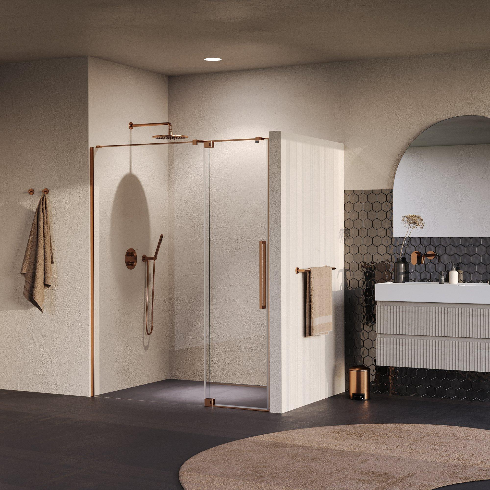 Cette porte de niche dégage une pure élégance grâce au verre clair combiné au revêtement PVD cuivre brossé. La teinte chaude du cuivre apporte une atmosphère unique et exclusive à votre salle de bains, que vous ne trouverez pas facilement ailleurs. Grâce au design minimaliste et à la finition de haute qualité, cette porte s’intègre sans effort dans divers styles d’intérieur, du moderne au classique. Vous créez ainsi une salle de bains qui est non seulement pratique, mais aussi un plaisir pour les yeux.